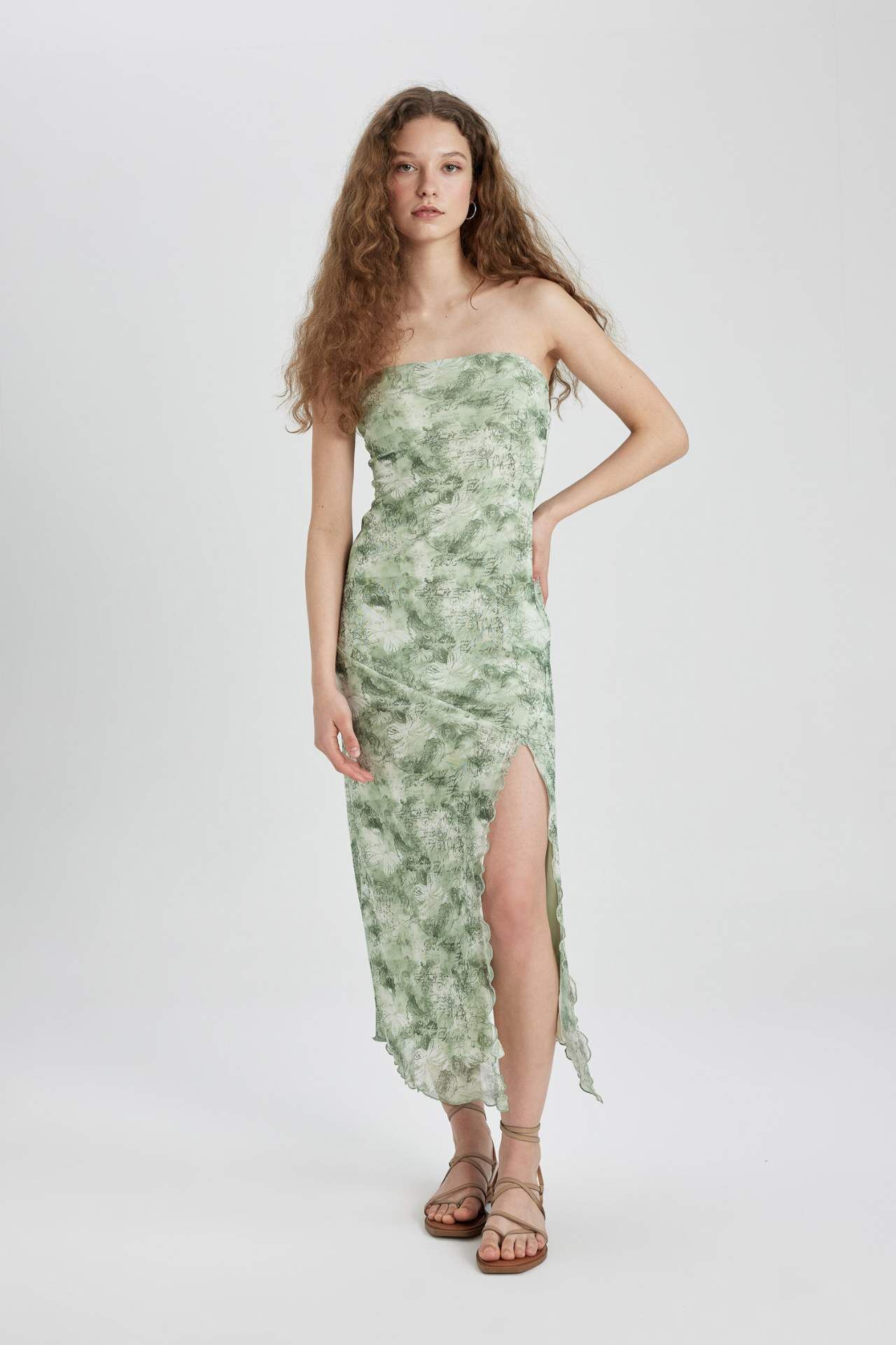 DeFactoFit Straplez Tül Desenli Midi Elbise