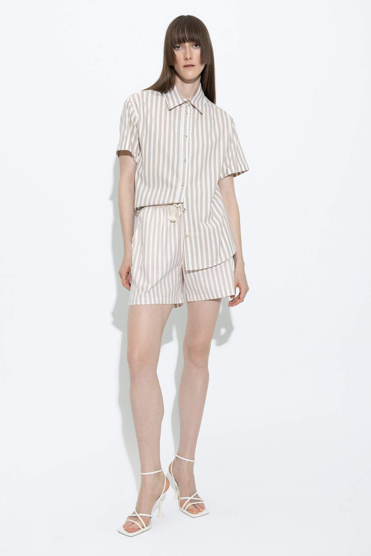 DeFactoFit Yüksek Bel Geniş Paça Keten Görünümlü Çizgili Şort Ekru