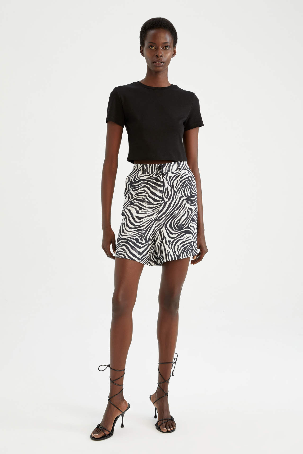 Şık zebra desenli viskon kumaşı, diz üstü boyu ve cepli modeli ile kendinden emin bir stil sunan, poplin gömlek, askılı atlet, basic tişört, kolsuz gömlek ve renkli yazlık bluzlarla rahatlıkla kombinleyebileceğiniz, bağcıklı ve lastikli kullanışlı bel tasarımıyla tatil valizinizin ilk parçalarından olacak DeFacto Kadın Cepli Maroken Şort. Viskoz 100% Manken Bedeni: Göğüs: 79 Boy: 1,79 Basen: 86 Bel: 59