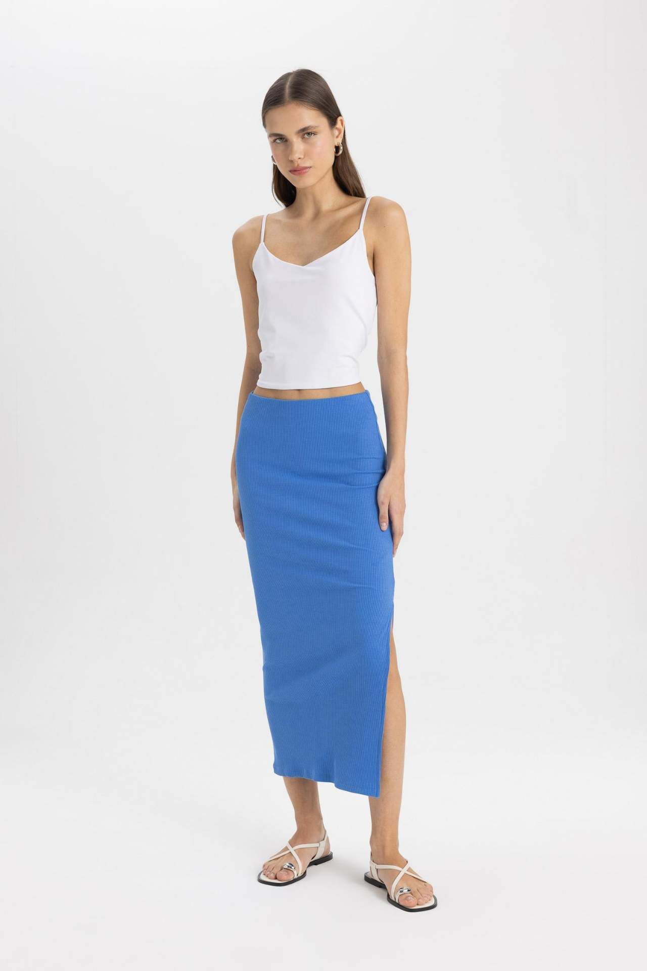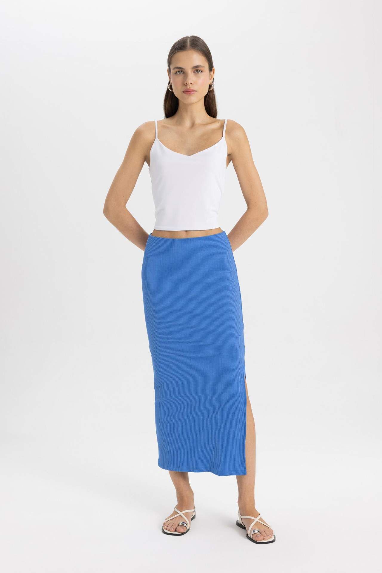 DeFactoFit Yüksek Bel Penye Astar Fitilli Kaşkorse Midi Etek