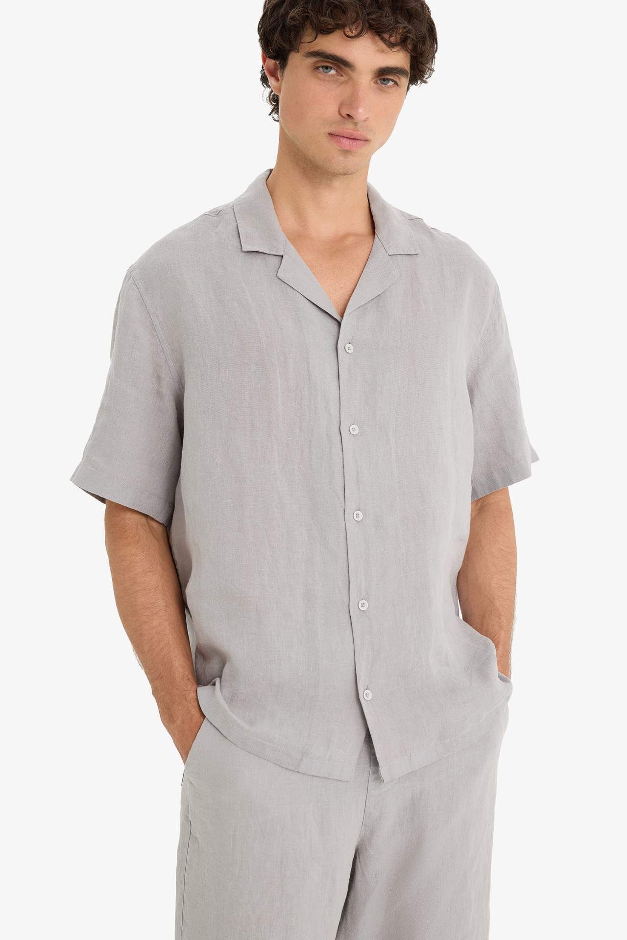 DeFacto %100 Keten Relax Fit Apaş Yaka Kısa Kollu Gömlek F4597AX25HSGR454