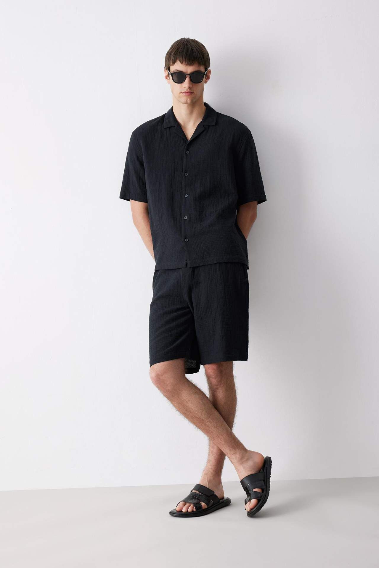 Yetişkin erkekler için yaz mevsimine uygun siyah pamuklu kısa kollu polo yaka gömlek. Kısa kollu ve relax fit kesimli olan bu gömlek, şık ve rahat bir görünüm sunar. MUSLIN_PLAIN stil tanımıyla öne çıkan bu ürün, dokuma üst kategorisinde yer almaktadır. Pamuk 100%,Pamuk 100%,Pamuk 100%,Pamuk 100%,Pamuk 100%,Pamuk 100%,Pamuk 100% Manken Bedeni: Göğüs: 93 Boy: 1,9 Basen: 91 Bel: 72