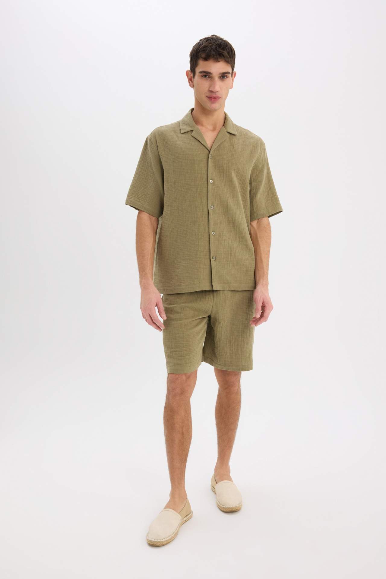 Yetişkin erkekler için yaz aylarında rahatlıkla tercih edebileceğiniz haki renkli pamuklu kısa kollu gömlek. Polo yaka detayıyla şıklık ve konforu buluşturan MUSLIN_PLAIN tasarımı. Relax fit kesimi ile vücuda rahatça oturur. Düz kalıbı ile şıklık ve şıklık arayanlar için ideal bir seçim. Pamuk 100%,Pamuk 100%,Pamuk 100%,Pamuk 100%,Pamuk 100%,Pamuk 100%,Pamuk 100% Manken Bedeni: Göğüs: 96 Boy: 1,89 Basen: 97 Bel: 77
