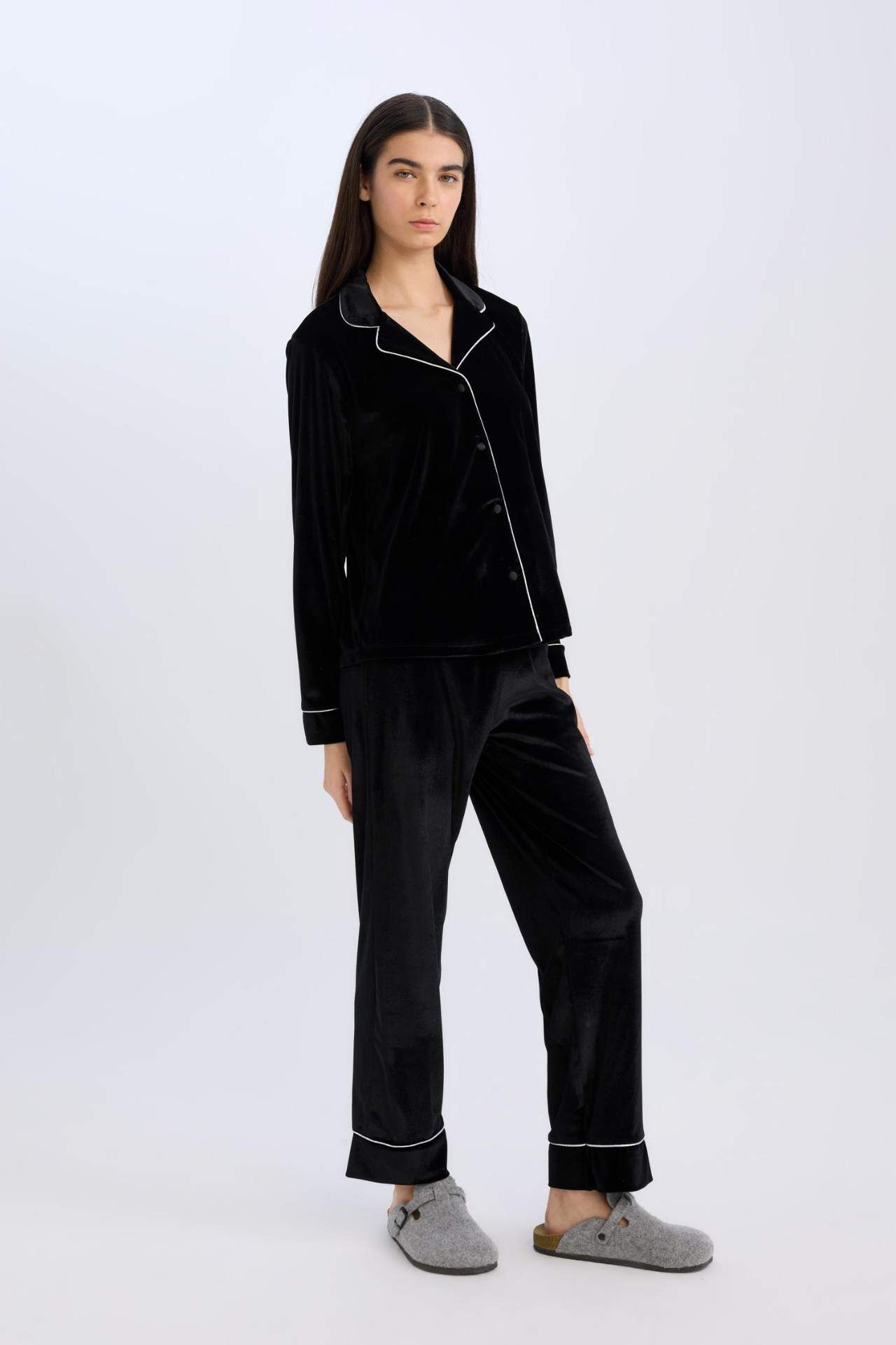 DeFacto 2'li Kadife Pijama Takımı Uzun Kolu Pijama Üstü Esnek Belli Uzun Pijama Altı