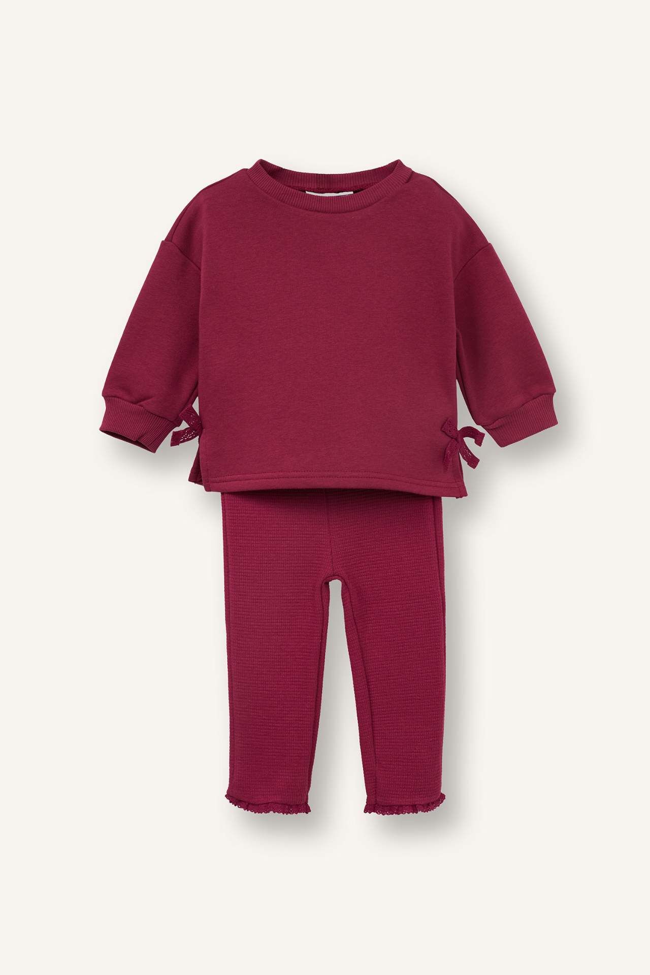 Şık fiyonk süslemeleri ve uyumlu iki parçalı yapısıyla hem günlük kullanımda hem de özel günlerde sevimli ve konforlu bir stil sunar. Pamuk 62%,Poliester 38%,Pamuk 77%,Poliester 23%