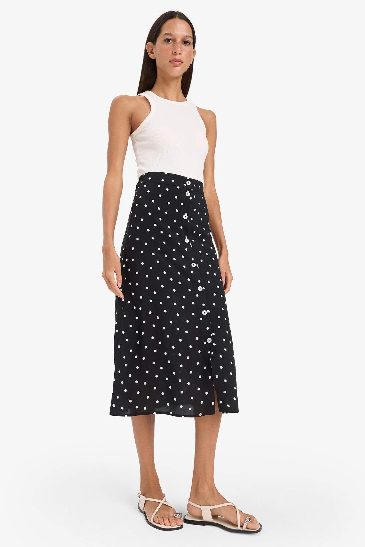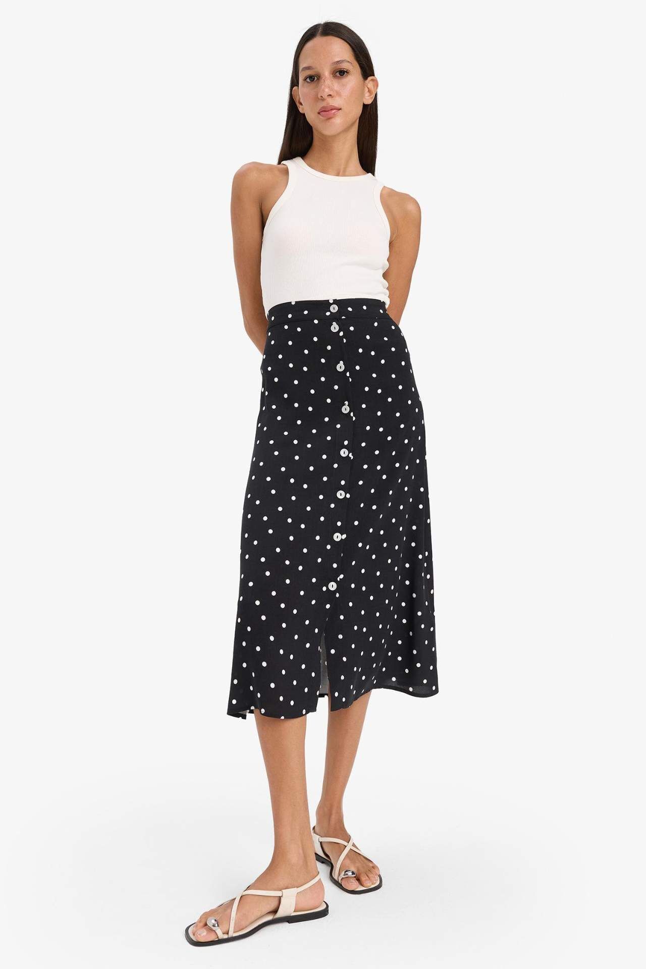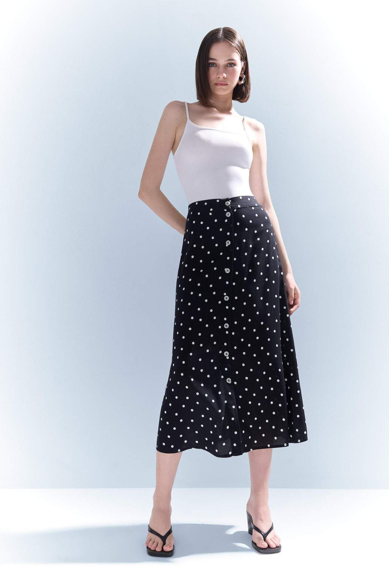 Puantiyeli deseni ve düğmeli tasarımıyla öne çıkan bu A form midi etek, nostaljik dokunuşlarla modern şıklığı buluşturur. Normal bel yapısıyla gün boyu rahatlık sağlar. Viskoz 100%,Viskoz 100%,Viskoz 100%,Viskoz 100% Manken Bedeni: Göğüs: 84 Boy: 1,76 Basen: 90 Bel: 61