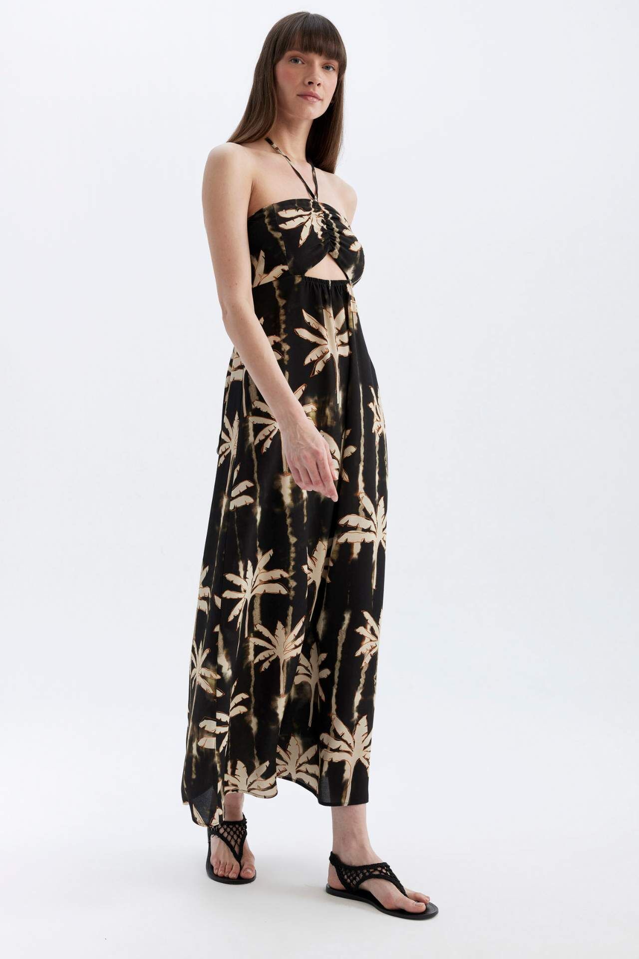 A Kesim Boyundan Bağlamalı Baskılı Maroken Maxi Elbise