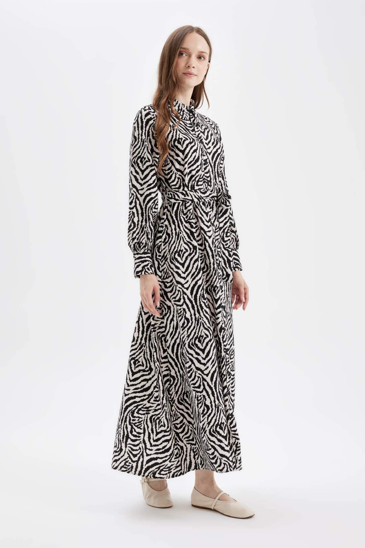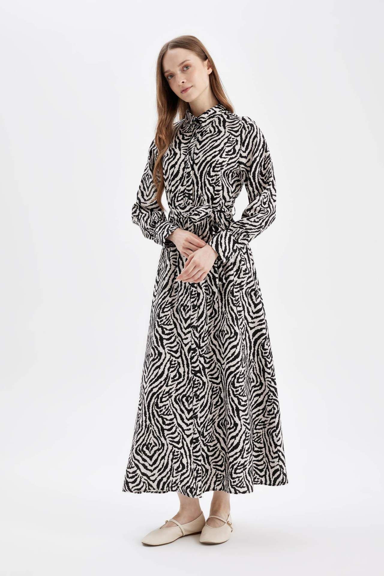 A Kesim Desenli Gömlek Yaka Uzun Kollu Maxi Elbise