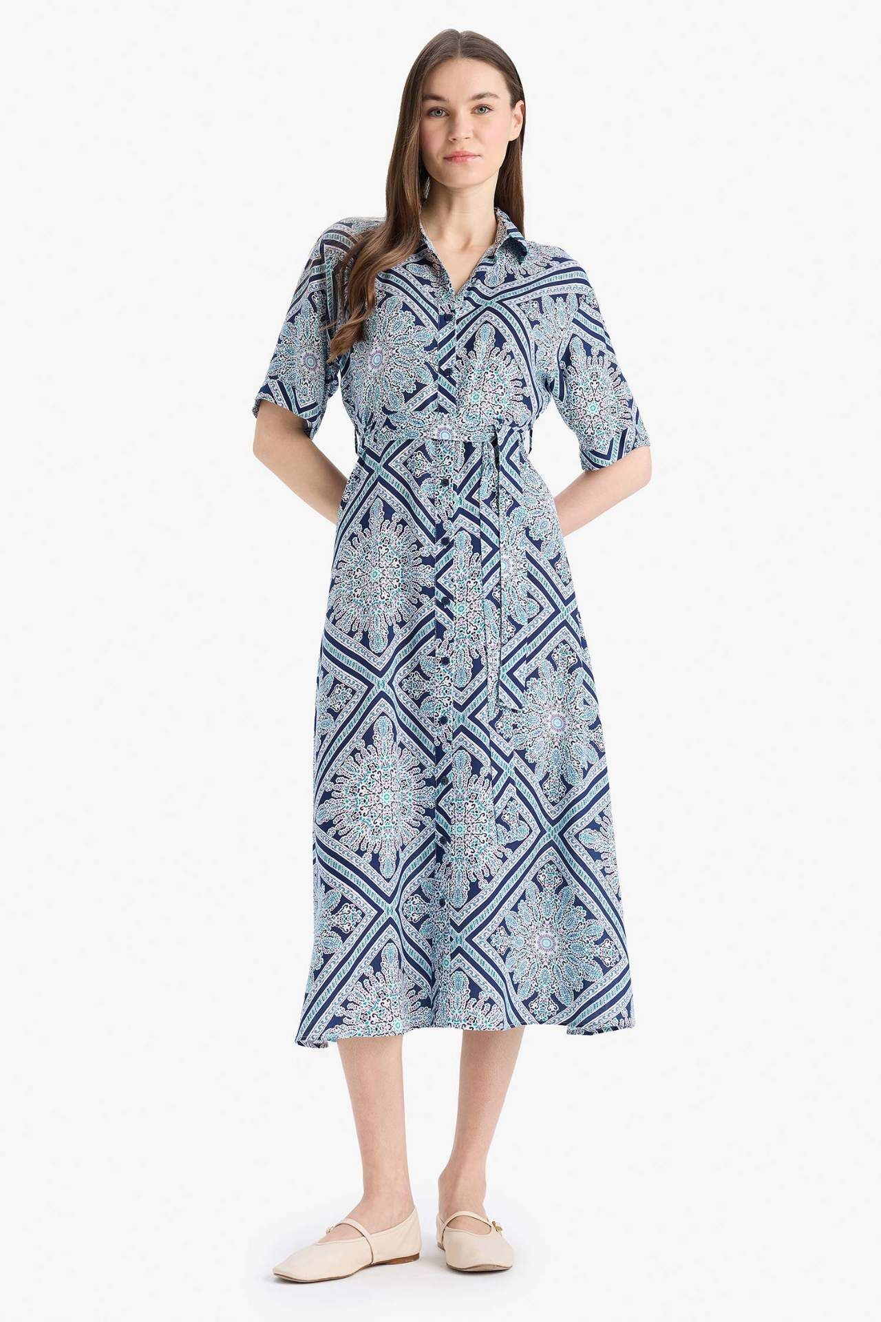 A Kesim Gömlek Yaka Desenli Bağcıklı Kısa Kollu Midi Elbise, desenli kumaşı ve bağcıklı detayıyla feminen ve şık bir görünüm yaratır. Gömlek yakası ve kısa kollarıyla hem rahat hem stil sahibi bir tercih sunar. Viskoz 100%,Viskoz 100%,Viskoz 100% Manken Bedeni: Göğüs: 82 Boy: 1,77 Basen: 91 Bel: 60
