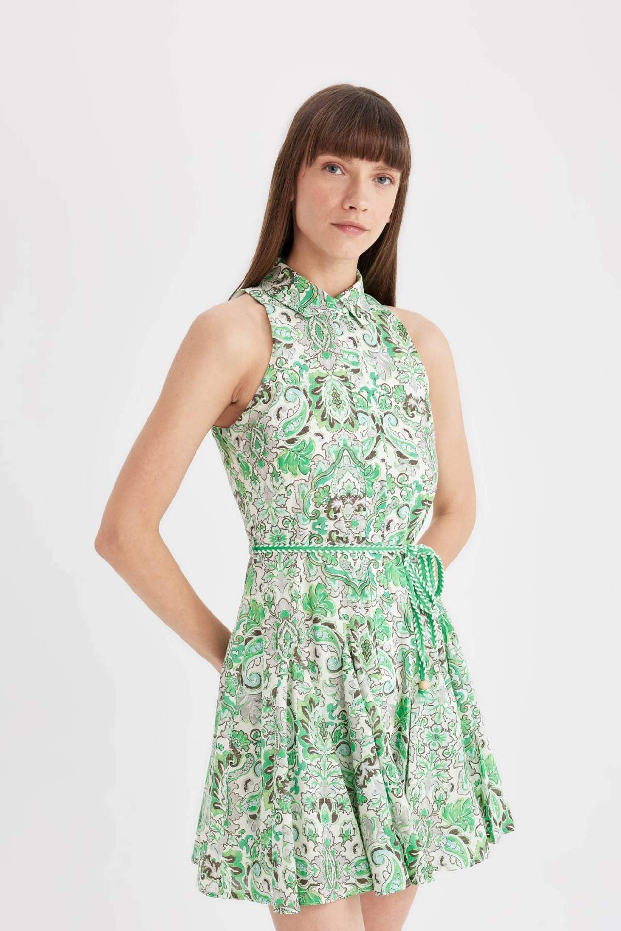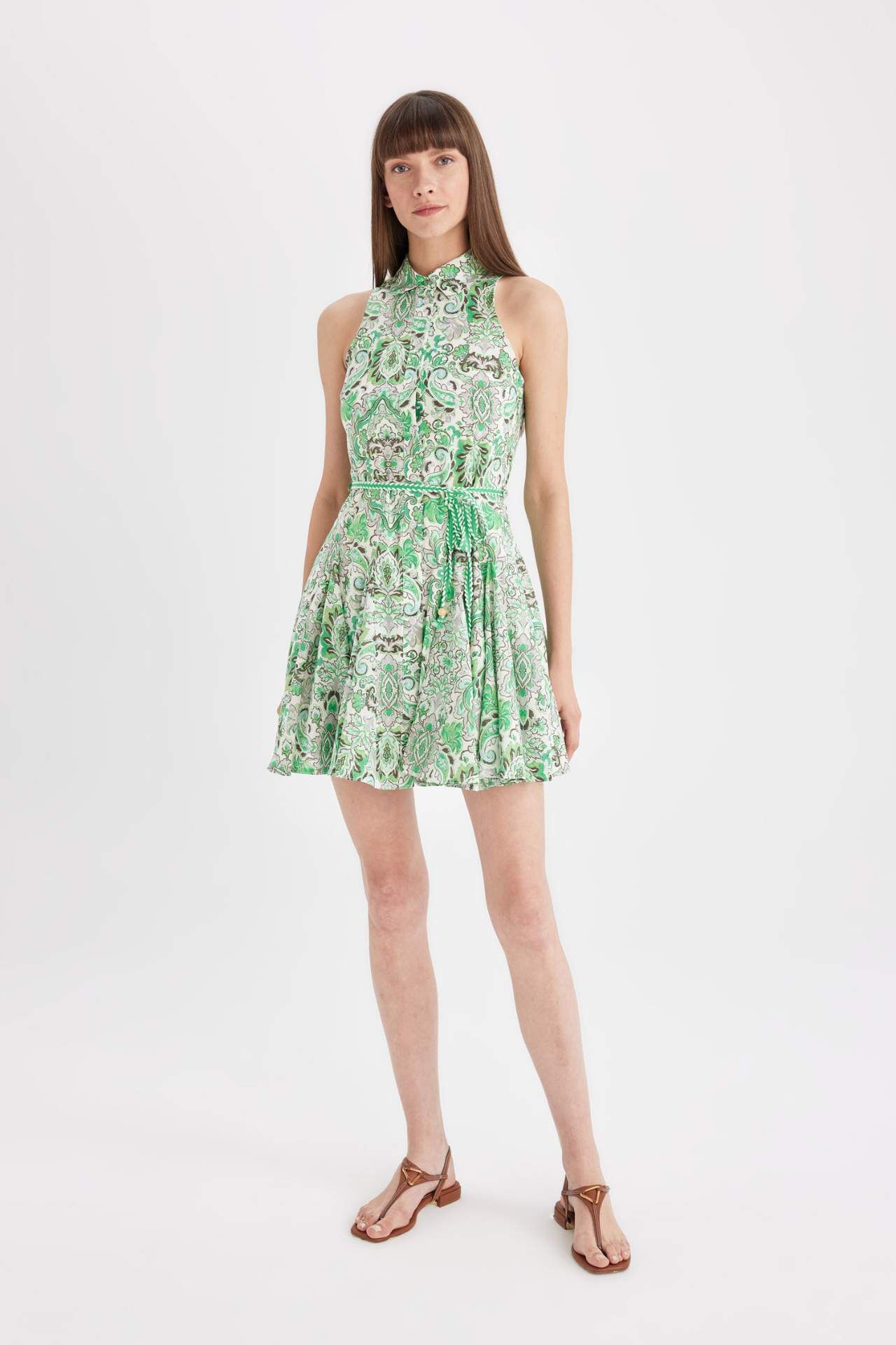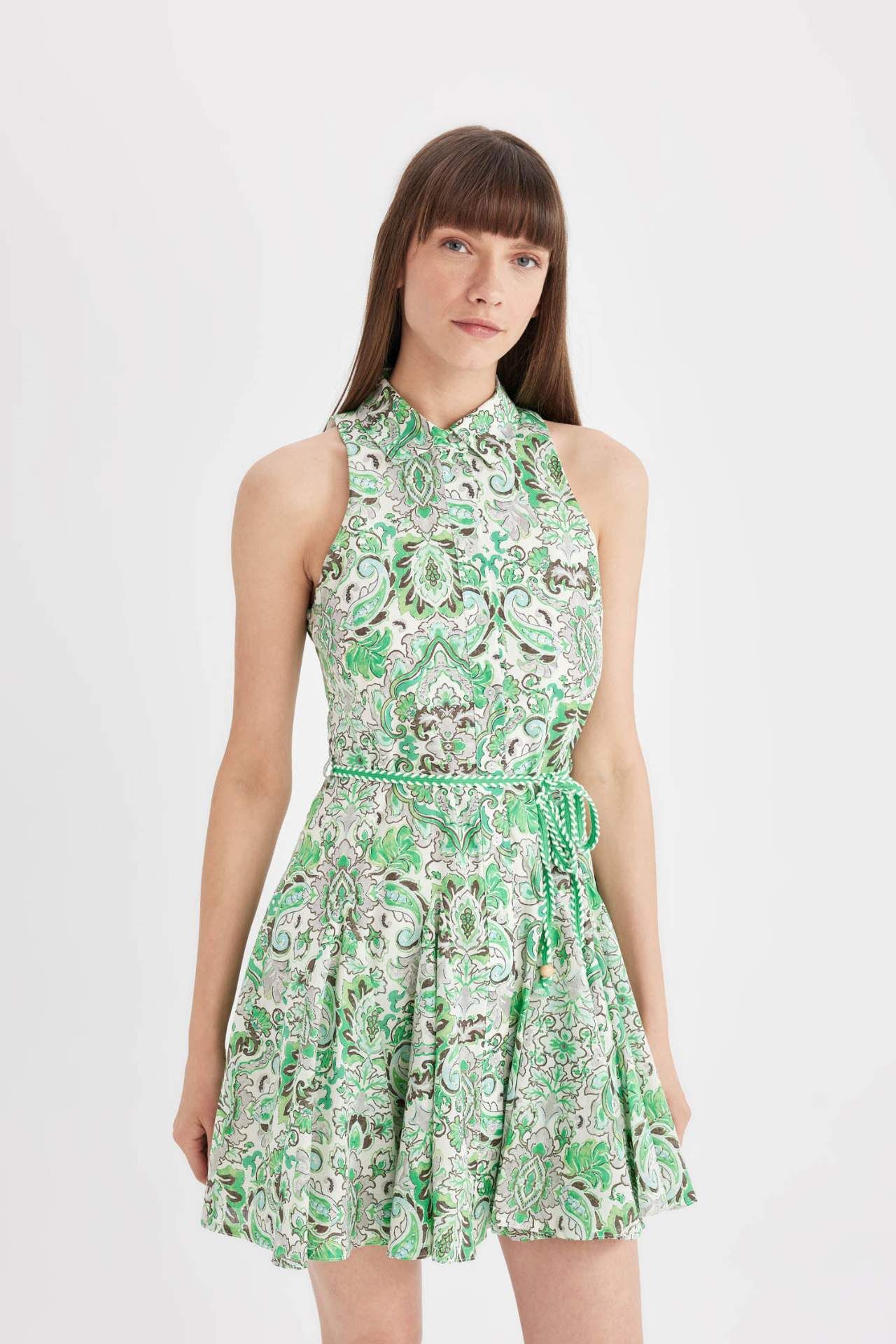 A Kesim Gömlek Yaka Desenli Vual Kolsuz Mini Elbise