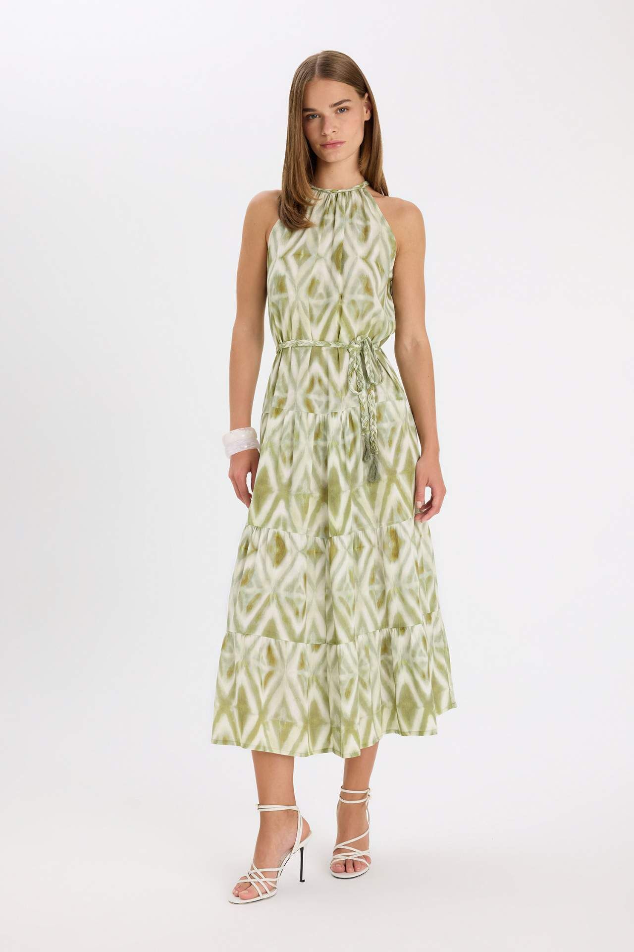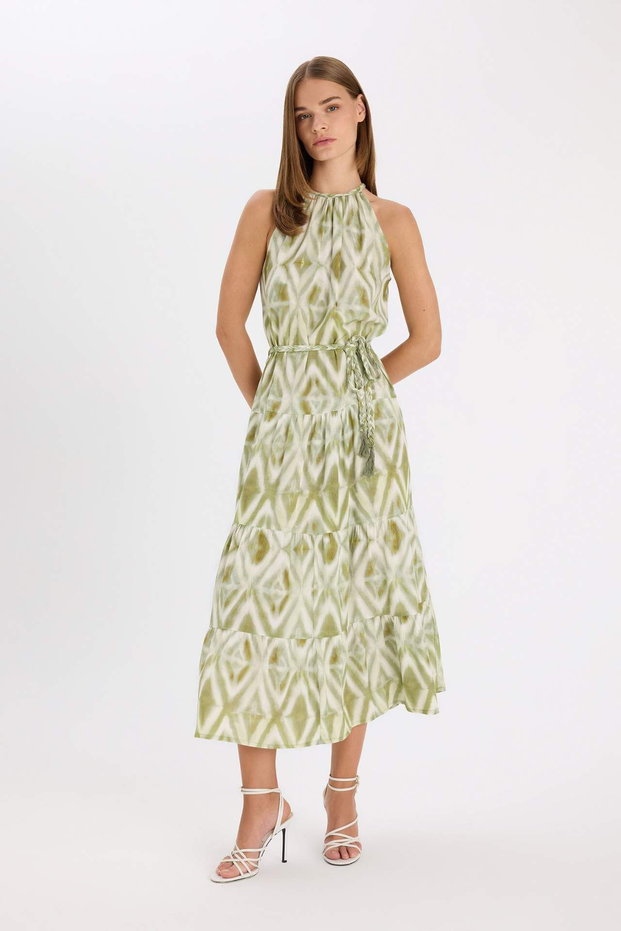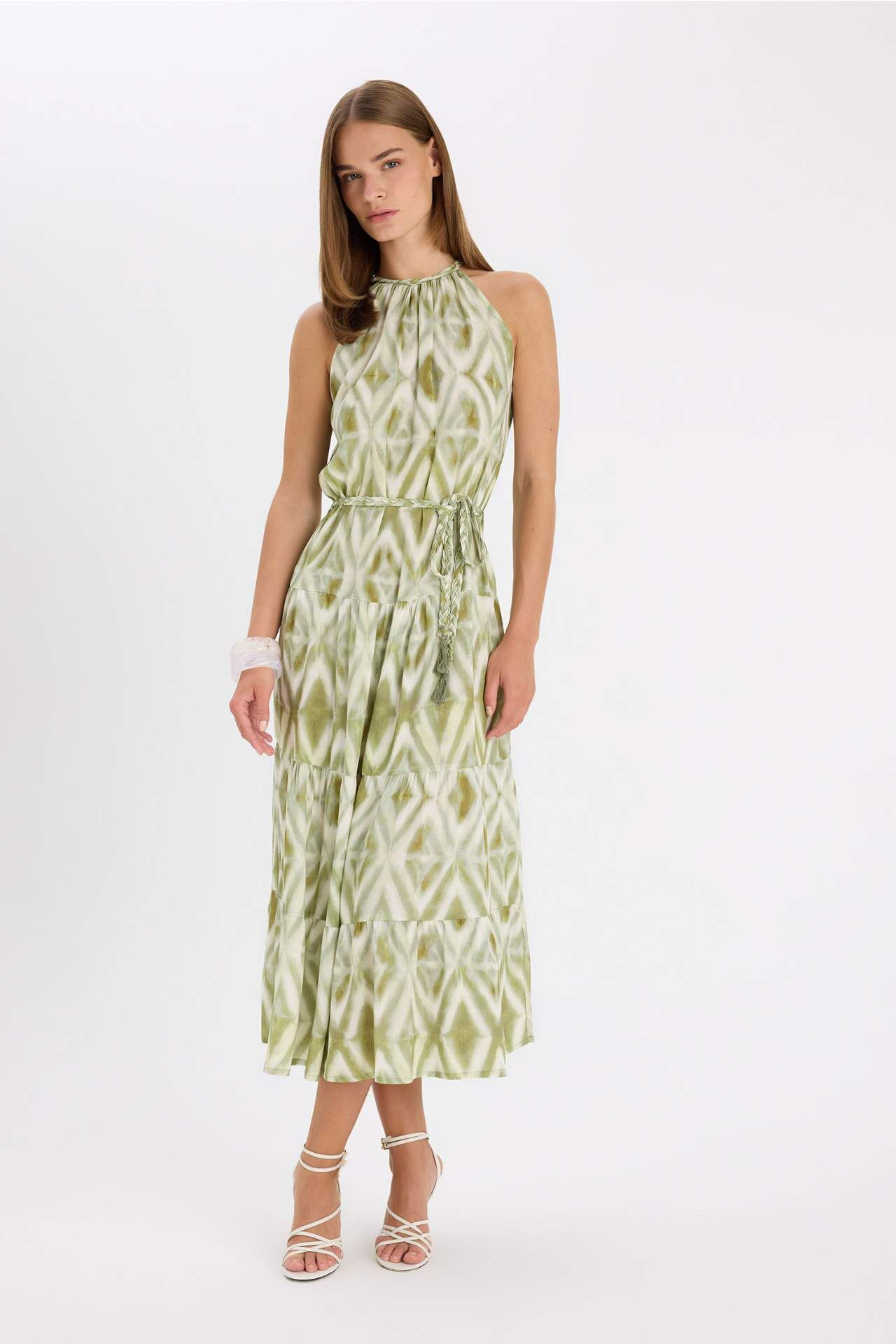 A Kesim Halter Yaka Baskılı Krinkıl Kumaş Kolsuz Maxi Elbise