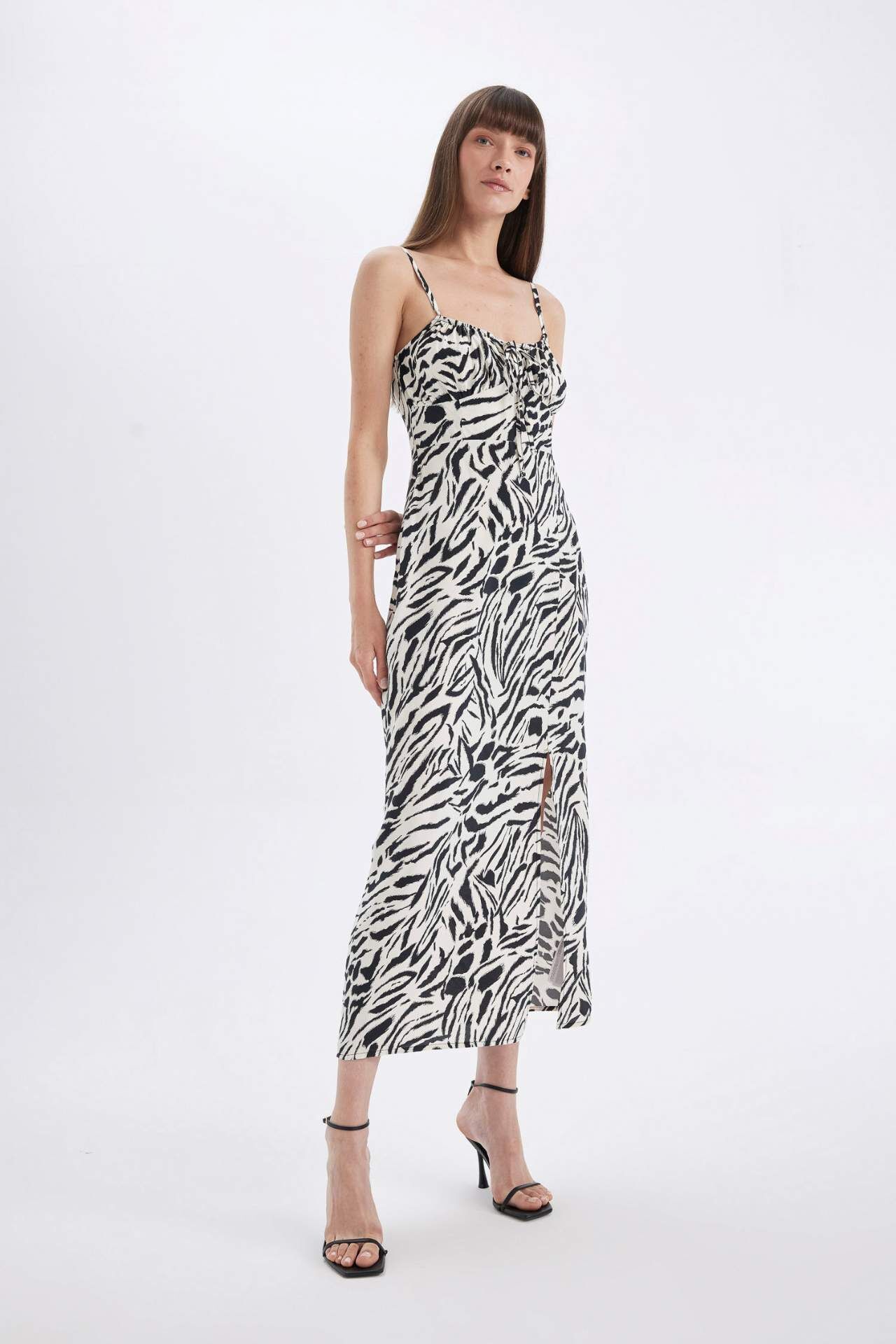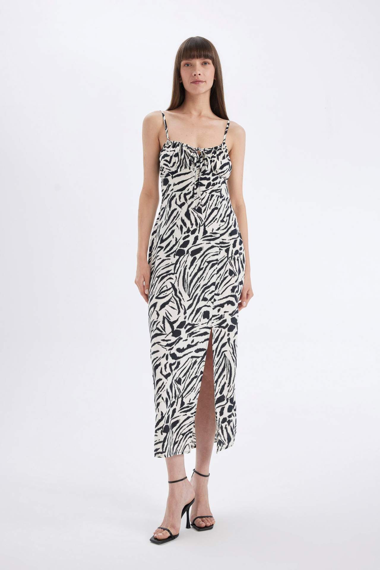 A Kesim Kalp Yaka Zebra Desenli Viskon Askılı Maxi Elbise