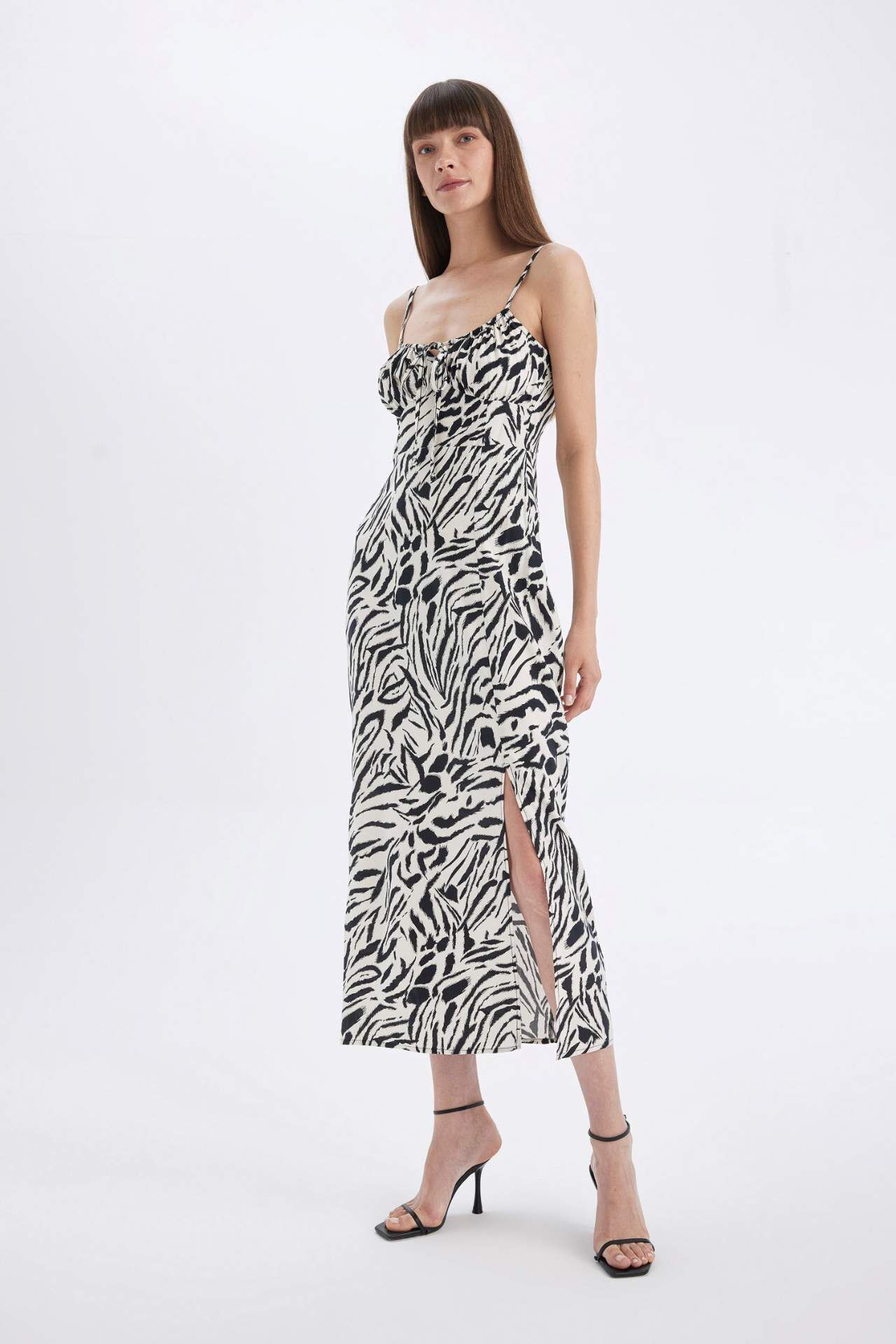 DeFacto A Kesim Kalp Yaka Zebra Desenli Viskon Askılı Maxi Elbise