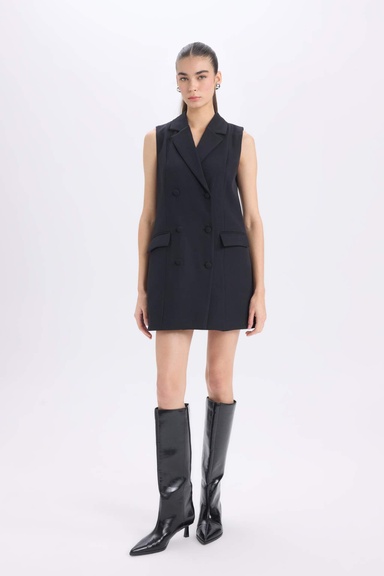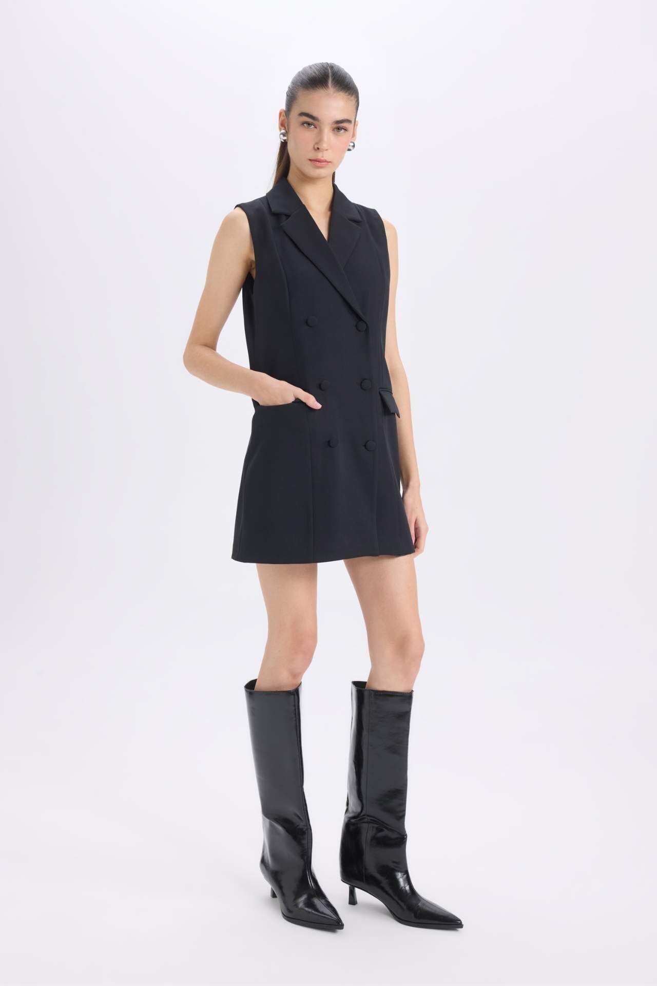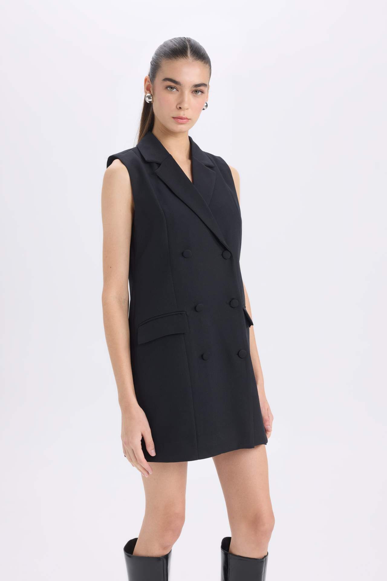 DeFacto A Kesim Kruvaze Yaka Düğme Kapamalı Basic Düz Kolsuz Midi Siyah Blazer Elbise