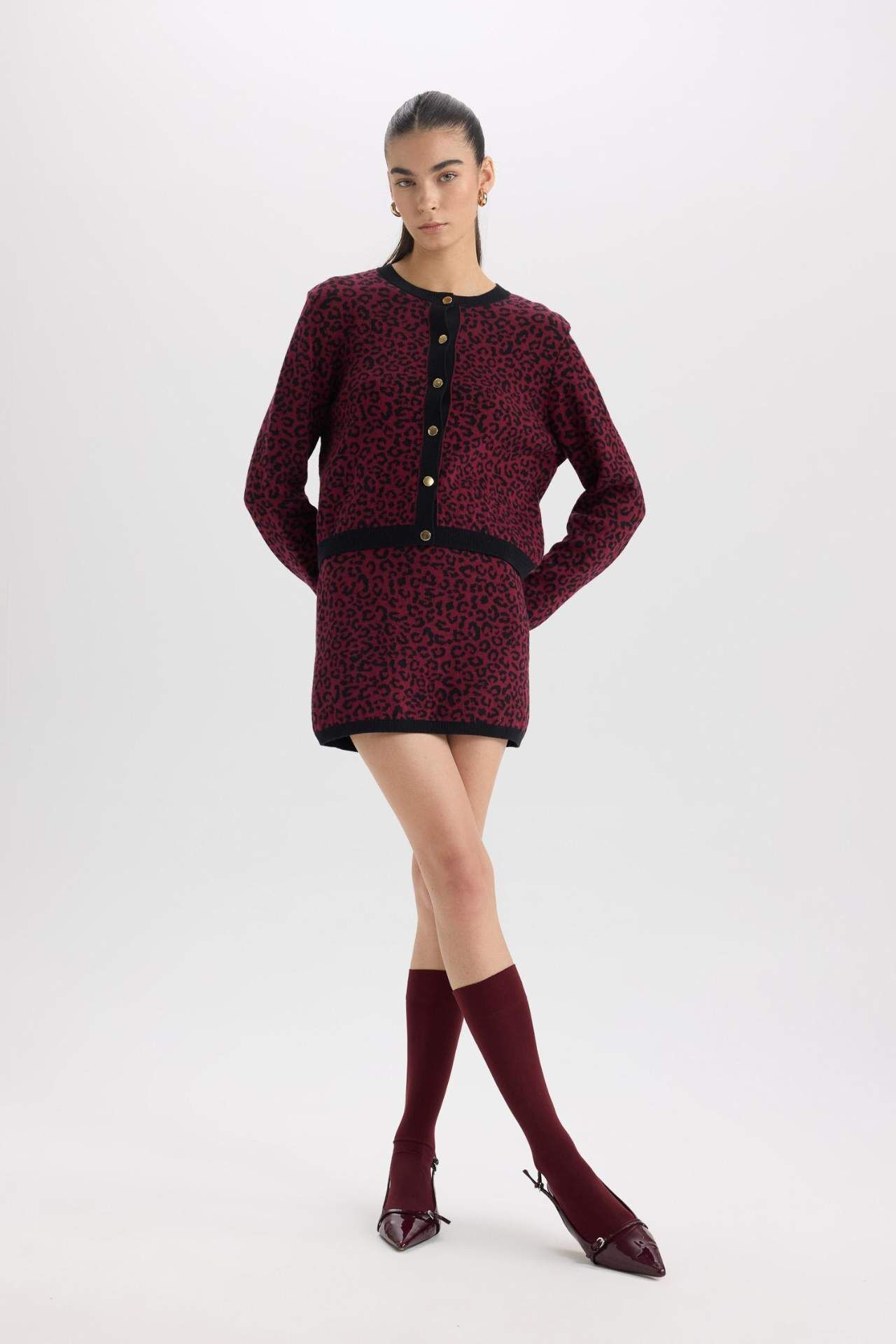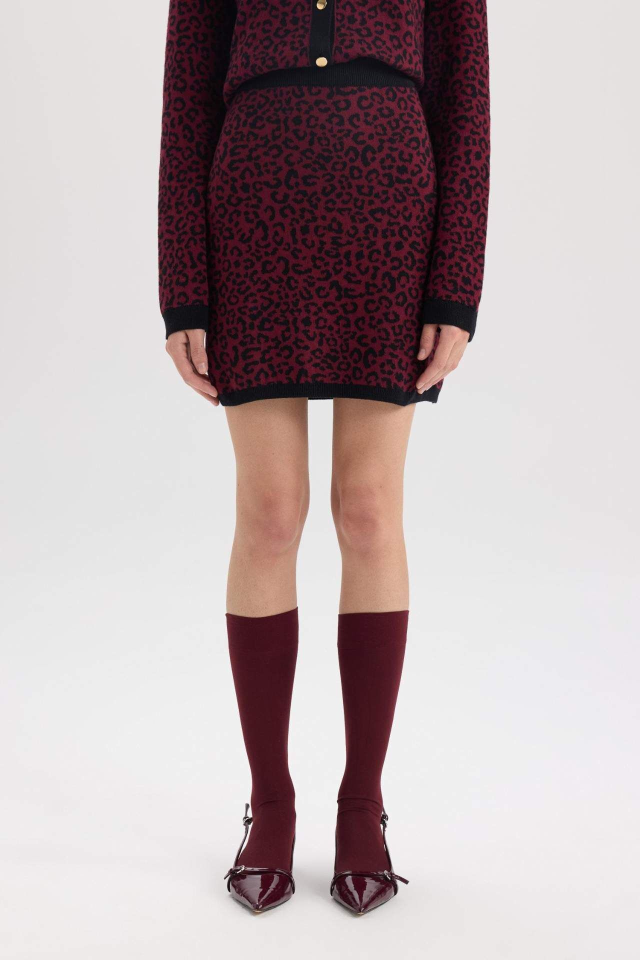 A Kesim Leopar Desenli Mini Triko Etek