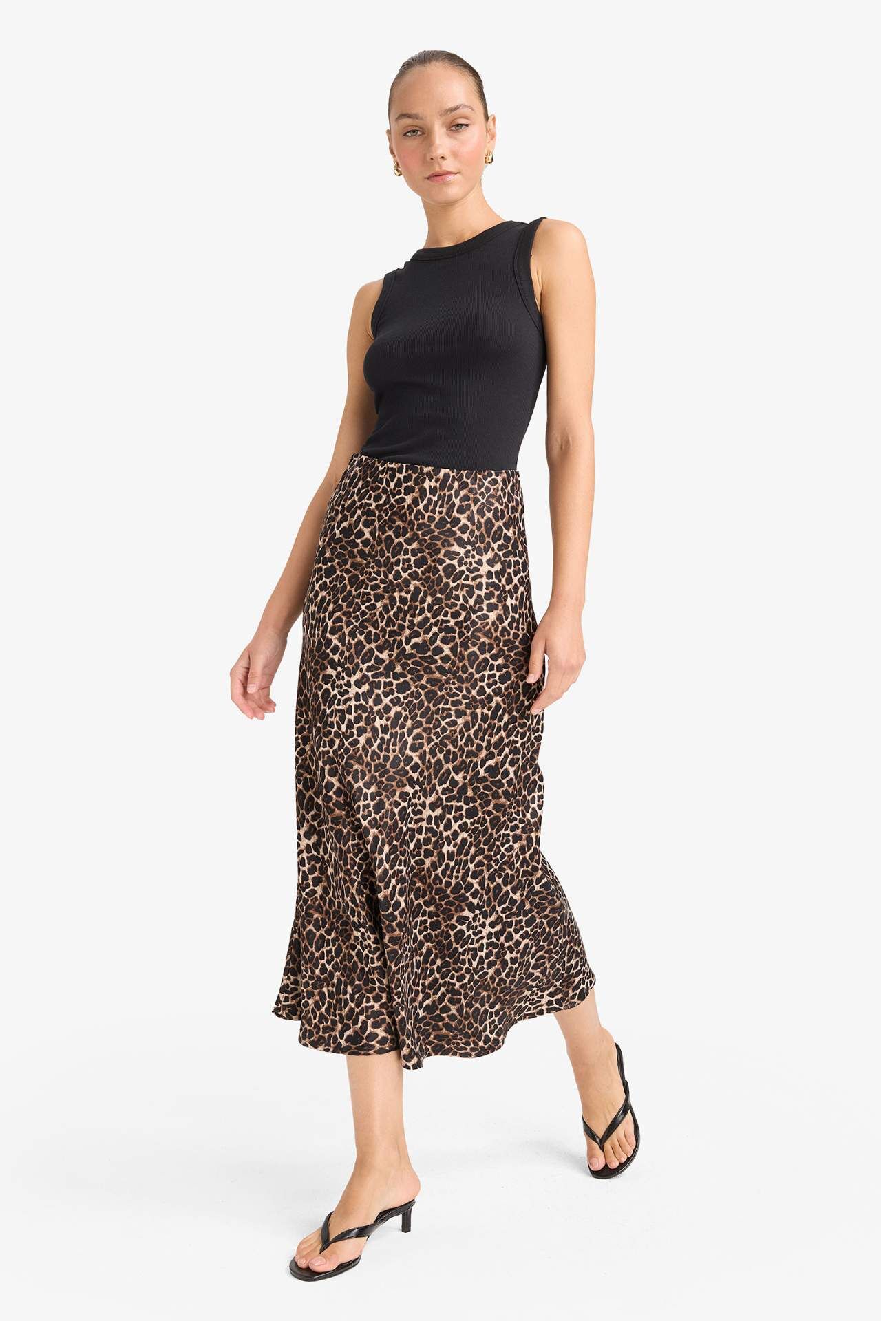 A kesim, normal bel leopar desenli saten midi etek, akıcı kumaşı ve iddialı deseniyle feminen bir şıklık sunar. Günlük stilinize zarif bir dokunuş katarken, özel gün kombinleri için de dikkat çekici bir tercihtir. Viskoz 100%,Viskoz 100%,Viskoz 100%,Viskoz 100%,Viskoz 100%,Viskoz 100% Manken Bedeni: Göğüs: 86 Boy: 1,78 Basen: 89 Bel: 60
