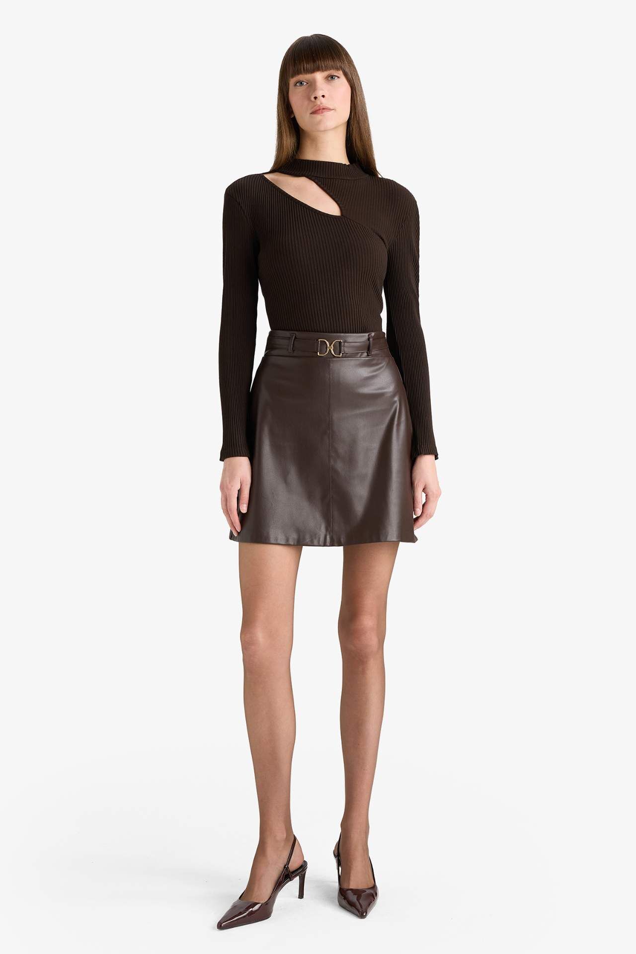 A Kesim Normal Bel Suni Deri Mini Etek