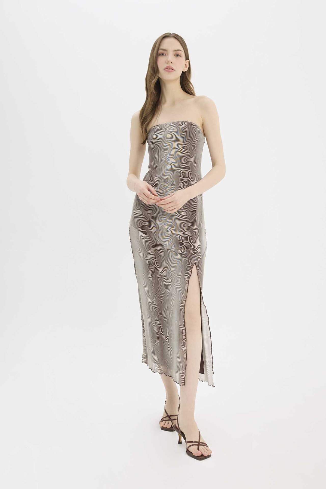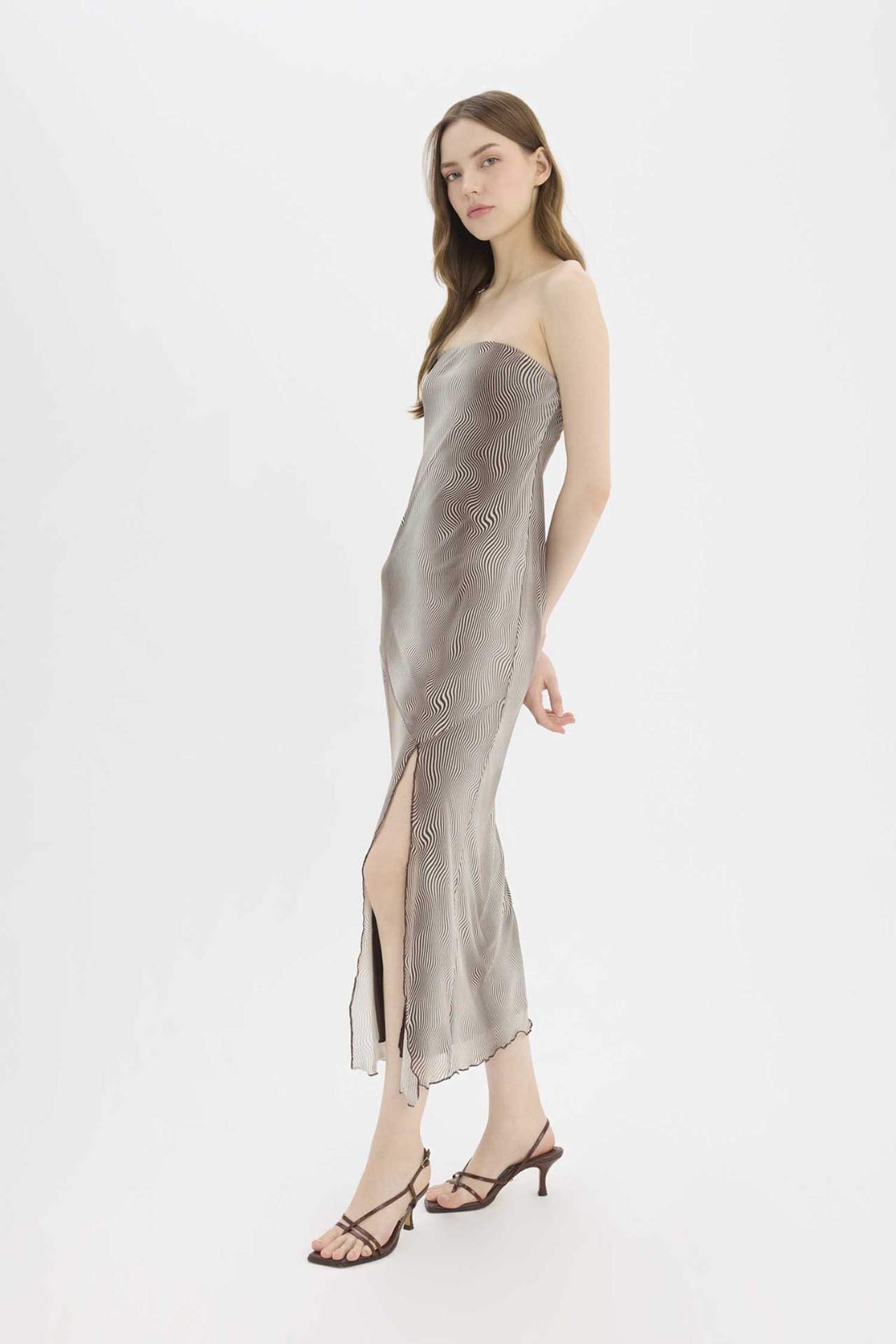 A Kesim Straplez Desenli Tül Yırtmaçlı Maxi Elbise