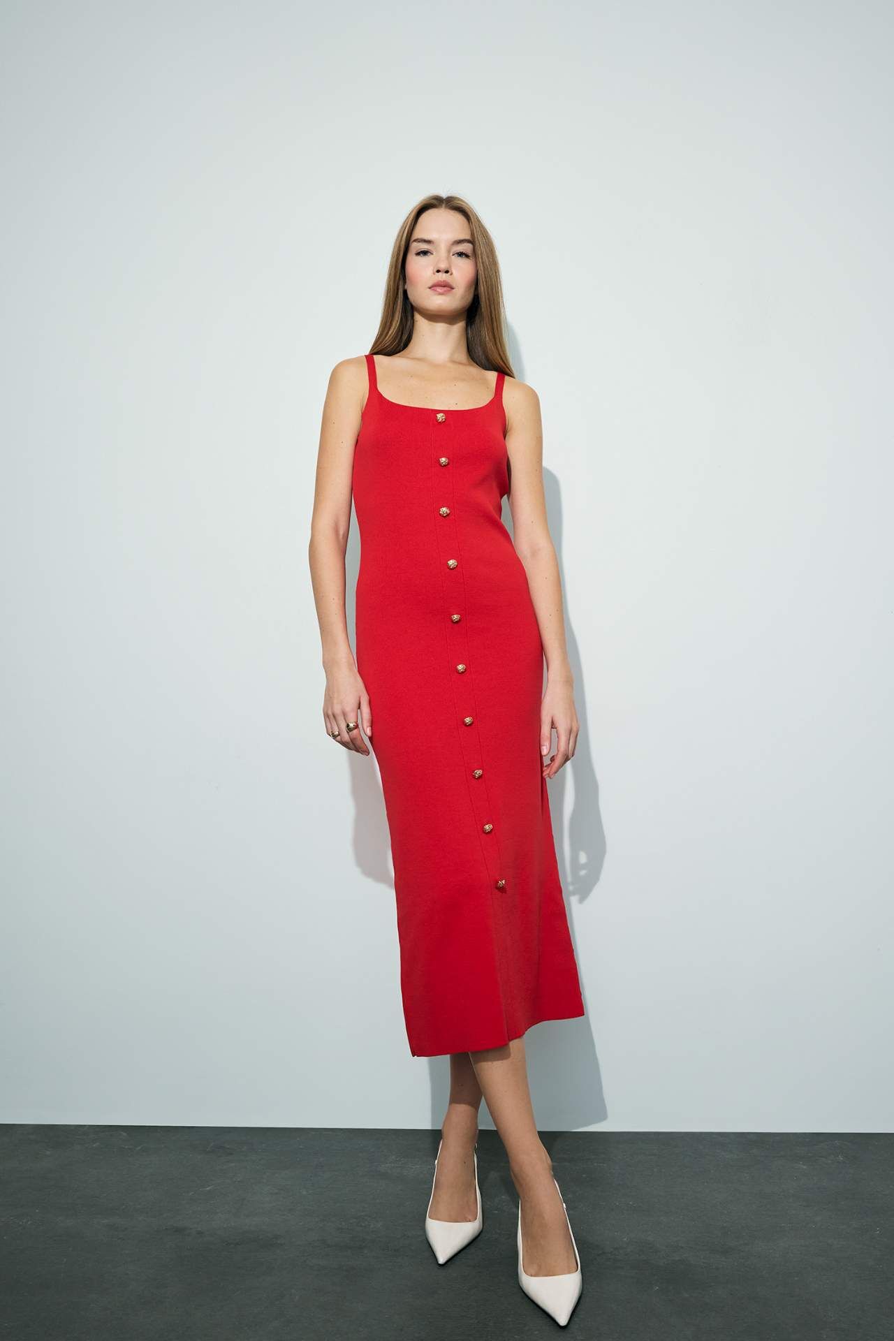 A kesim triko askılı midi elbise, vücuda oturan formu ve akıcı dokusuyla zarif bir siluet sunar. Askılı tasarımıyla yaz aylarında hafif ve şık bir tercih olurken, kat kat kombinlemeye de uygundur. Günlük stilinize modern ve feminen bir dokunuş katar. Poliester 100%,Poliester 100%,Poliester 100%,Poliester 100%,Poliester 100%,Poliester 100% Manken Bedeni: Göğüs: 82 Boy: 1,77 Basen: 88 Bel: 59