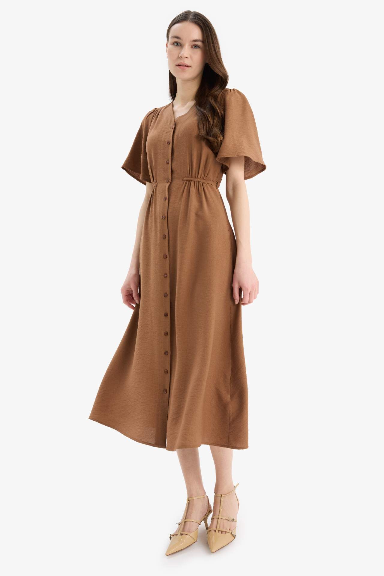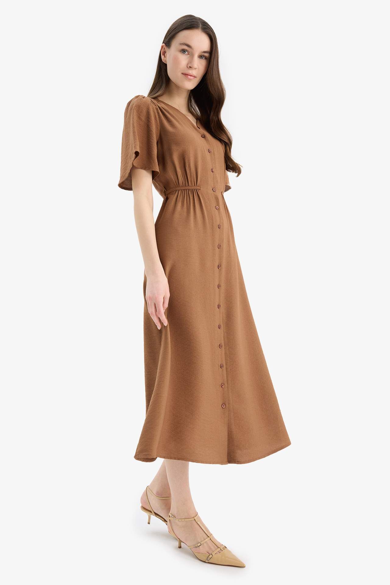 A Kesim V Yaka Kısa Kollu Midi Elbise