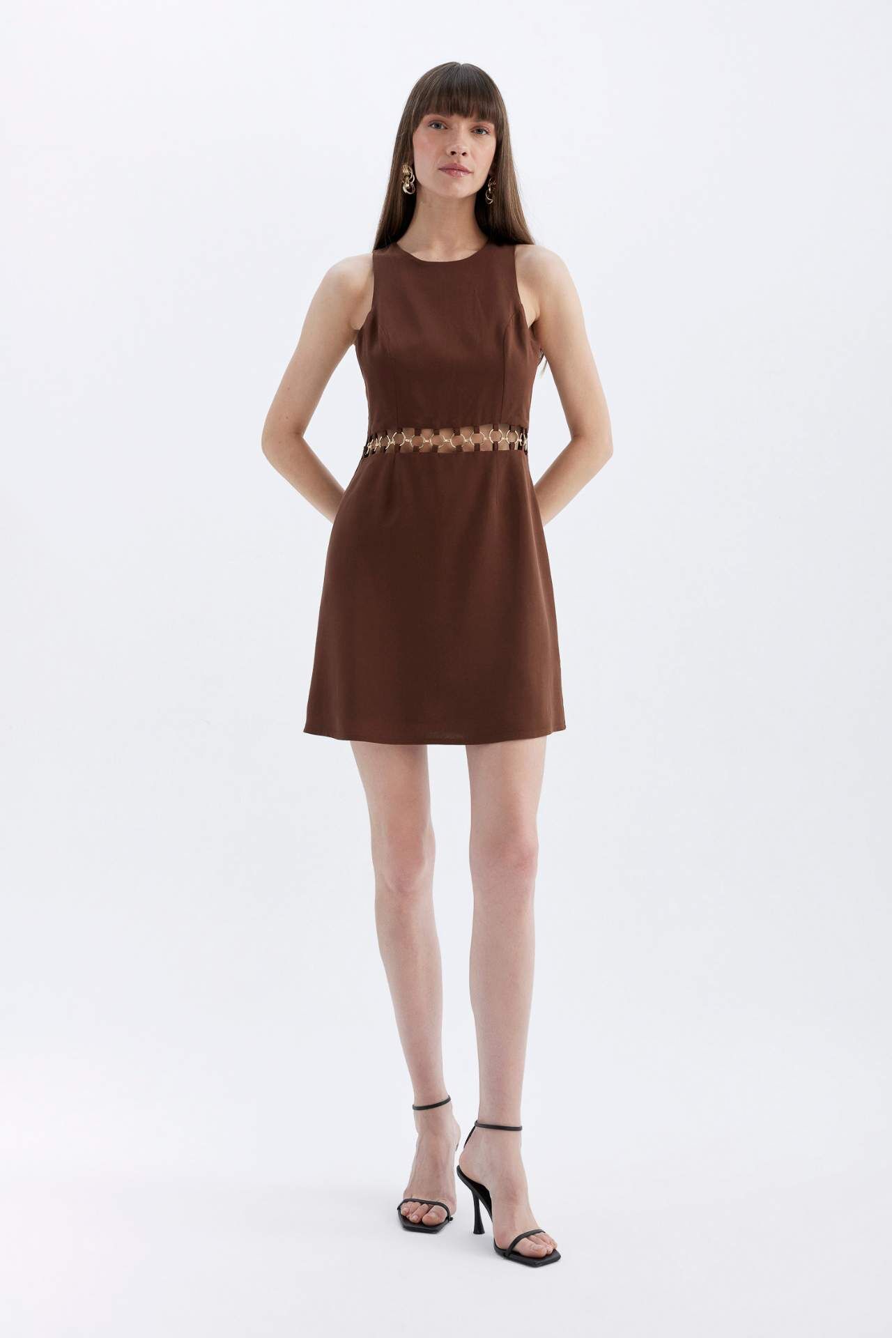 A Kesim Yuvarlak Yaka Keten Karışımlı Kolsuz Midi Elbise