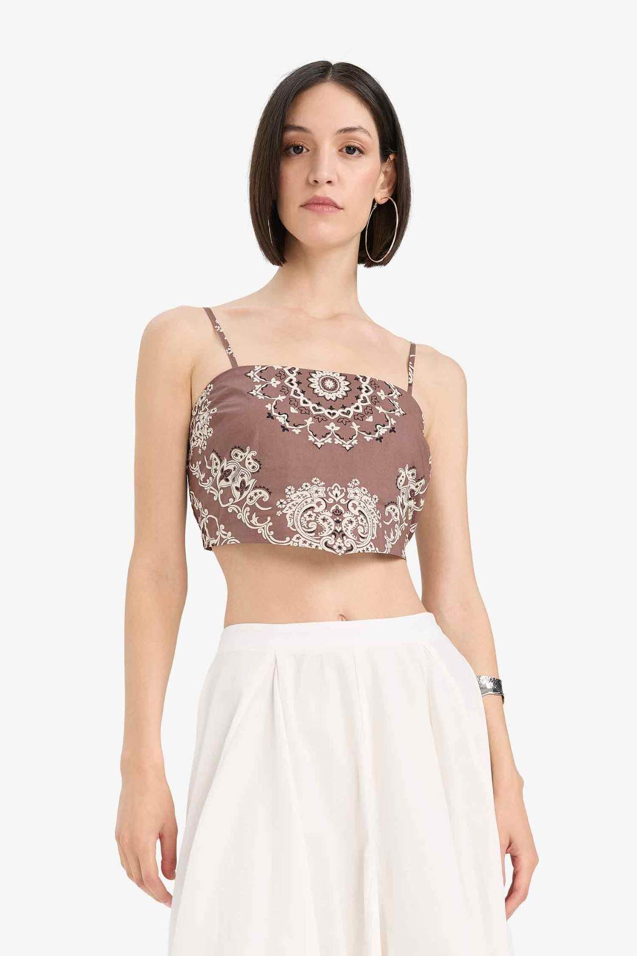 Afra x DeFacto Kare Yaka Vual Desenli Askılı Bluz