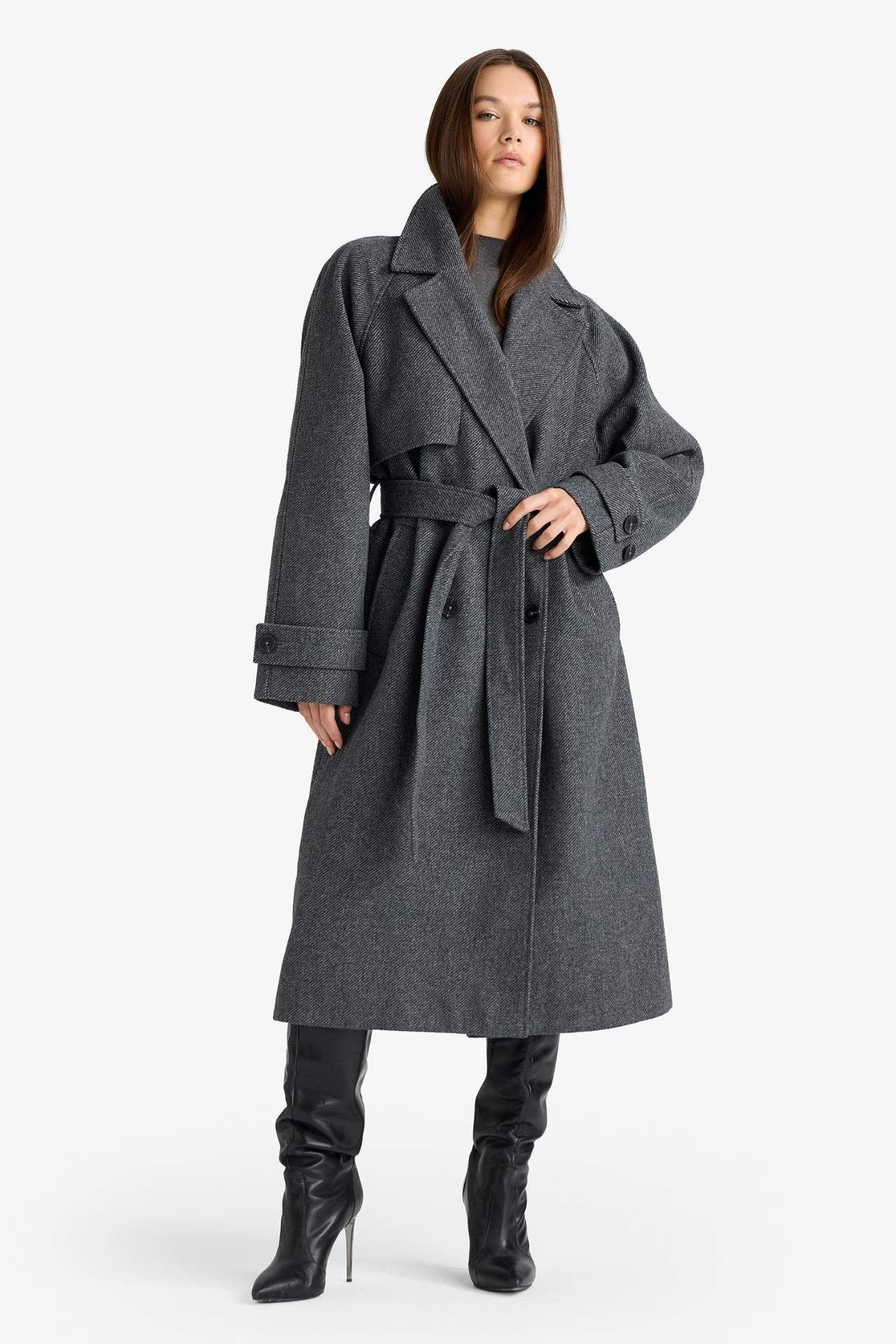 Afra x DeFacto Kuşaklı Cepli Uzun Kaşe Kaban