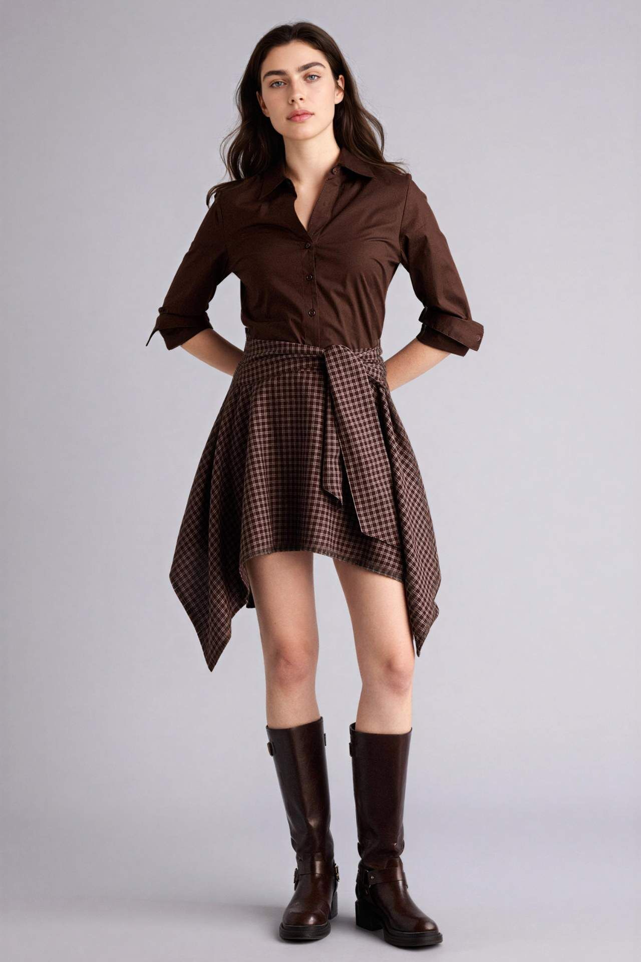 Asimetrik kareli flanel etek, hareketli kesimi ve klasik kare desenini modern bir yorumla buluşturur. Yumuşak flanel kumaşı sayesinde hem şık hem de rahat bir kullanım sunar. Pamuk 100% Manken Bedeni: Göğüs: 87 Boy: 1,79 Basen: 94 Bel: 64