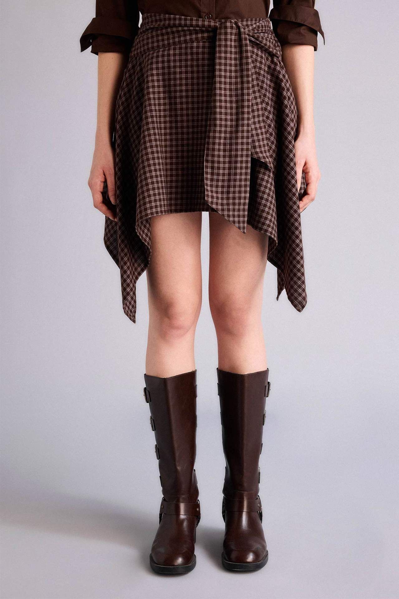 Asimetrik Kareli Normal Bel Flanel Midi Etek