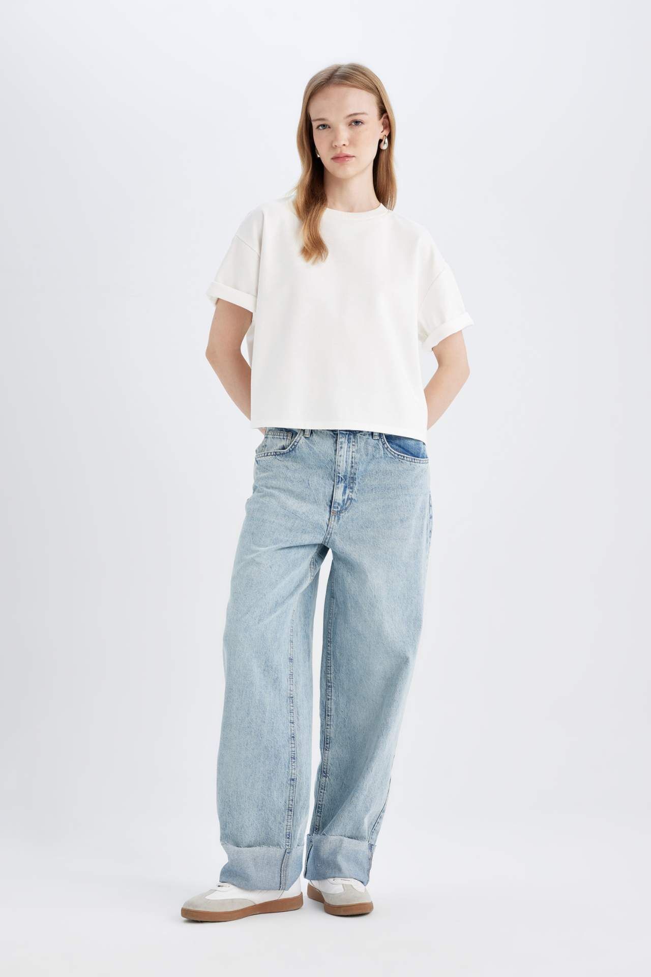 Baggy Cuff Baggy Yüksek Bel Katlamalı Paça Bilek Boy Jean Yıkamalı Pantolon