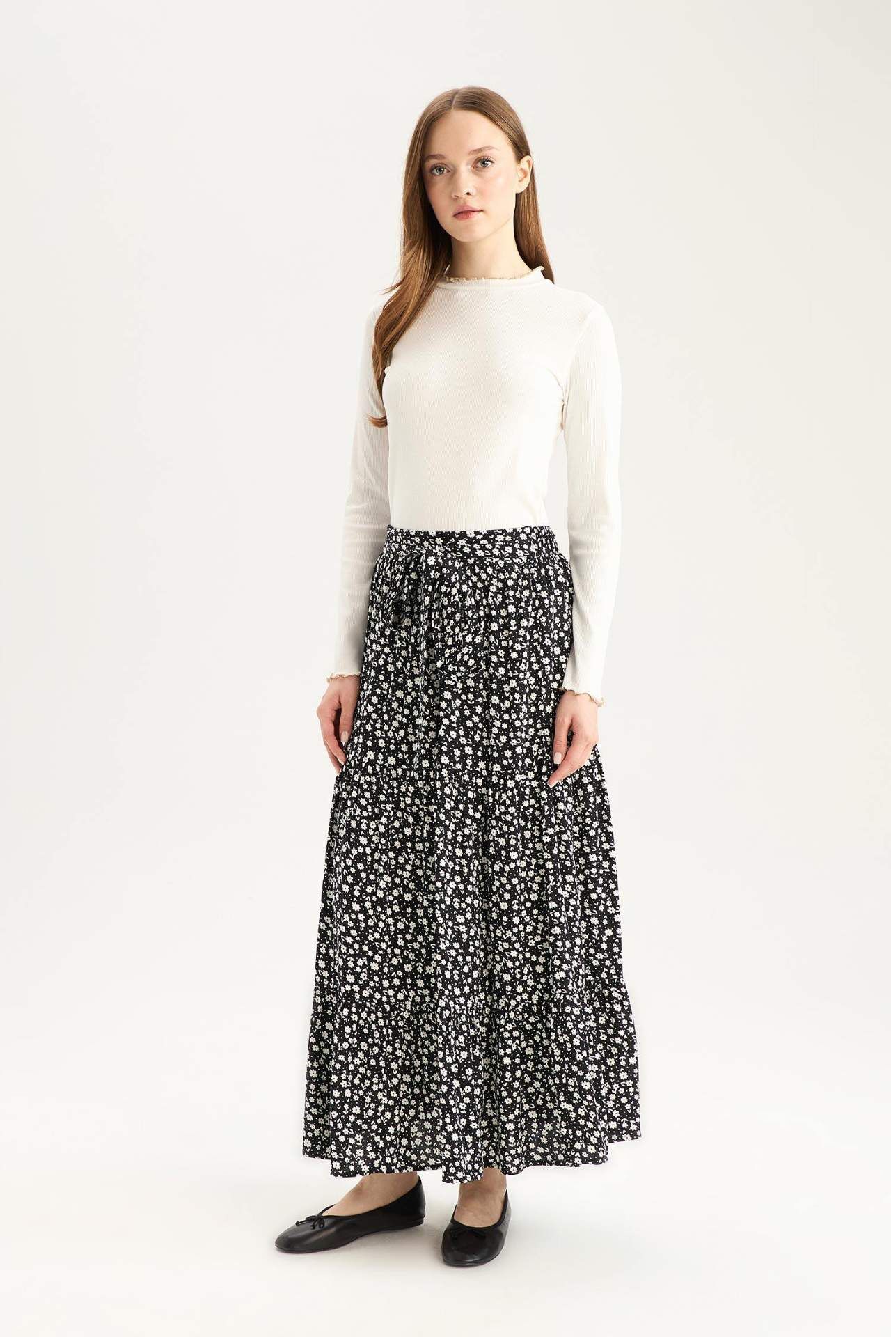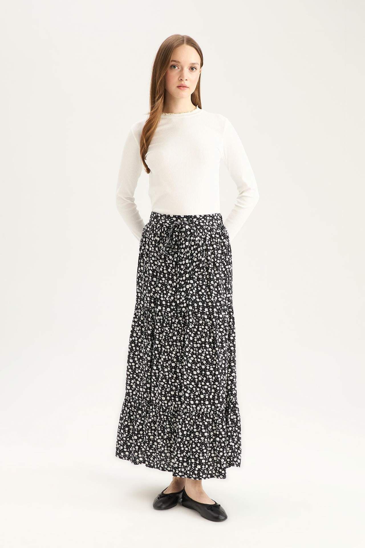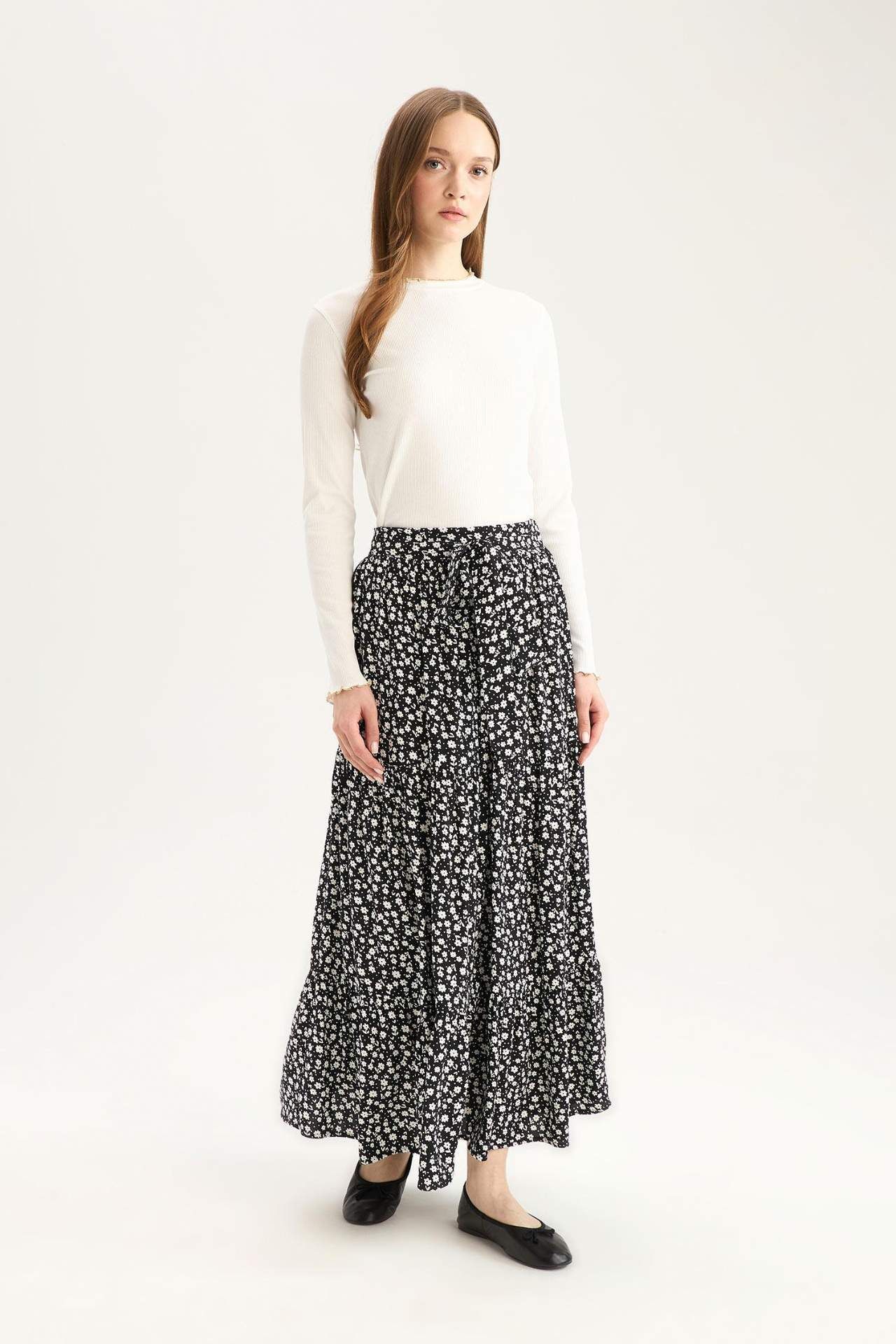 Çiçek Desenli Beli Bağcıklı Viskon Maxi Etek, romantik çiçek desenleri ve hafif viskon kumaşıyla yaz gardırobunuzun vazgeçilmezi. Beli bağcıklı detayıyla hem şık hem de rahat bir kullanım sunar. Viskoz 100%,Viskoz 100%,Viskoz 100% Manken Bedeni: Göğüs: 84 Boy: 1,74 Basen: 92 Bel: 61