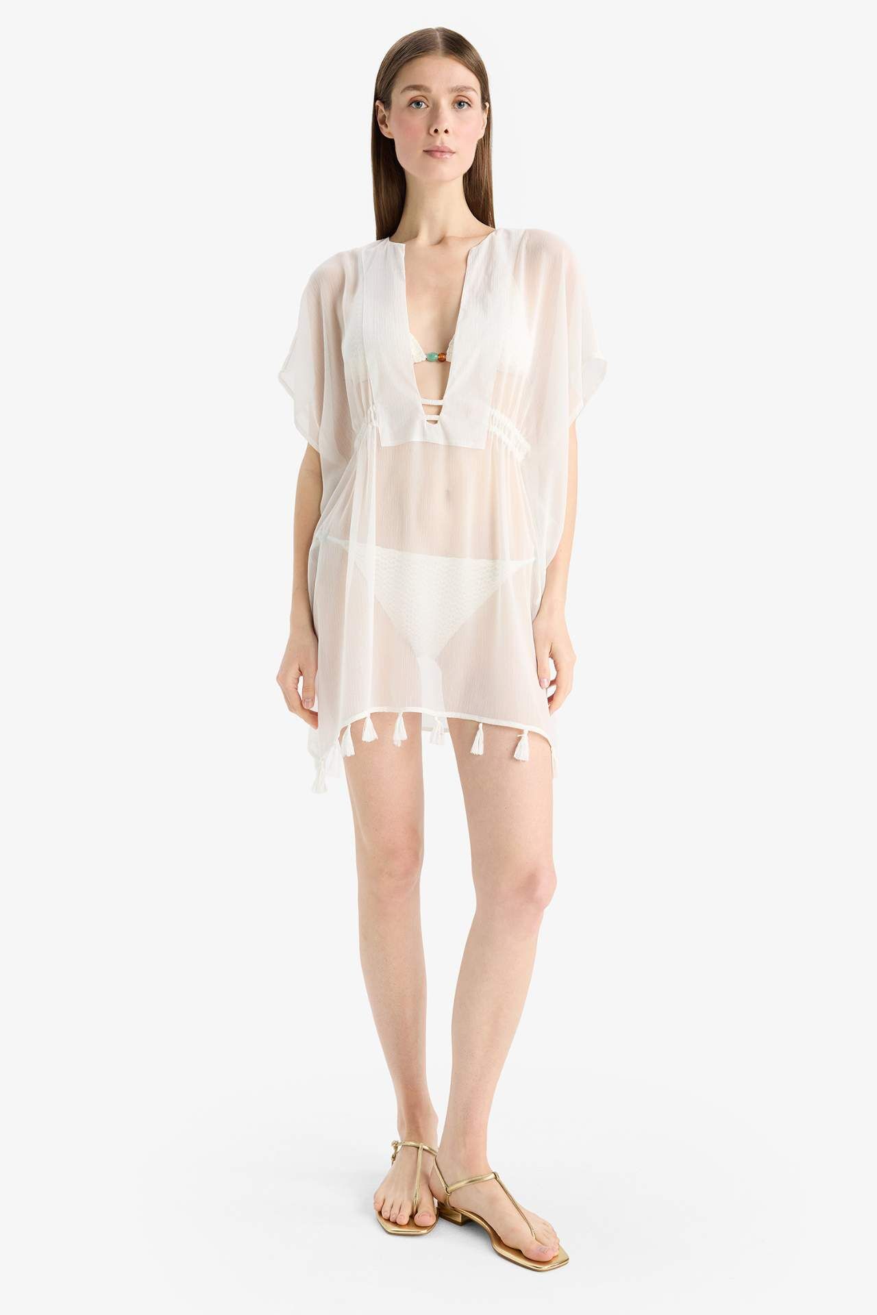 Beyaz Şifon Kimono, hafif ve uçuşan yapısıyla plajda zarif bir görünüm sunar. Şeffaf dokusu ve sade tasarımı sayesinde mayo ve bikinilerle şık bir uyum yakalar. Poliester 100%,Poliester 100%,Poliester 100%,Poliester 100%,Poliester 100% Manken Bedeni: Göğüs: 82 Boy: 1,79 Basen: 90 Bel: 60