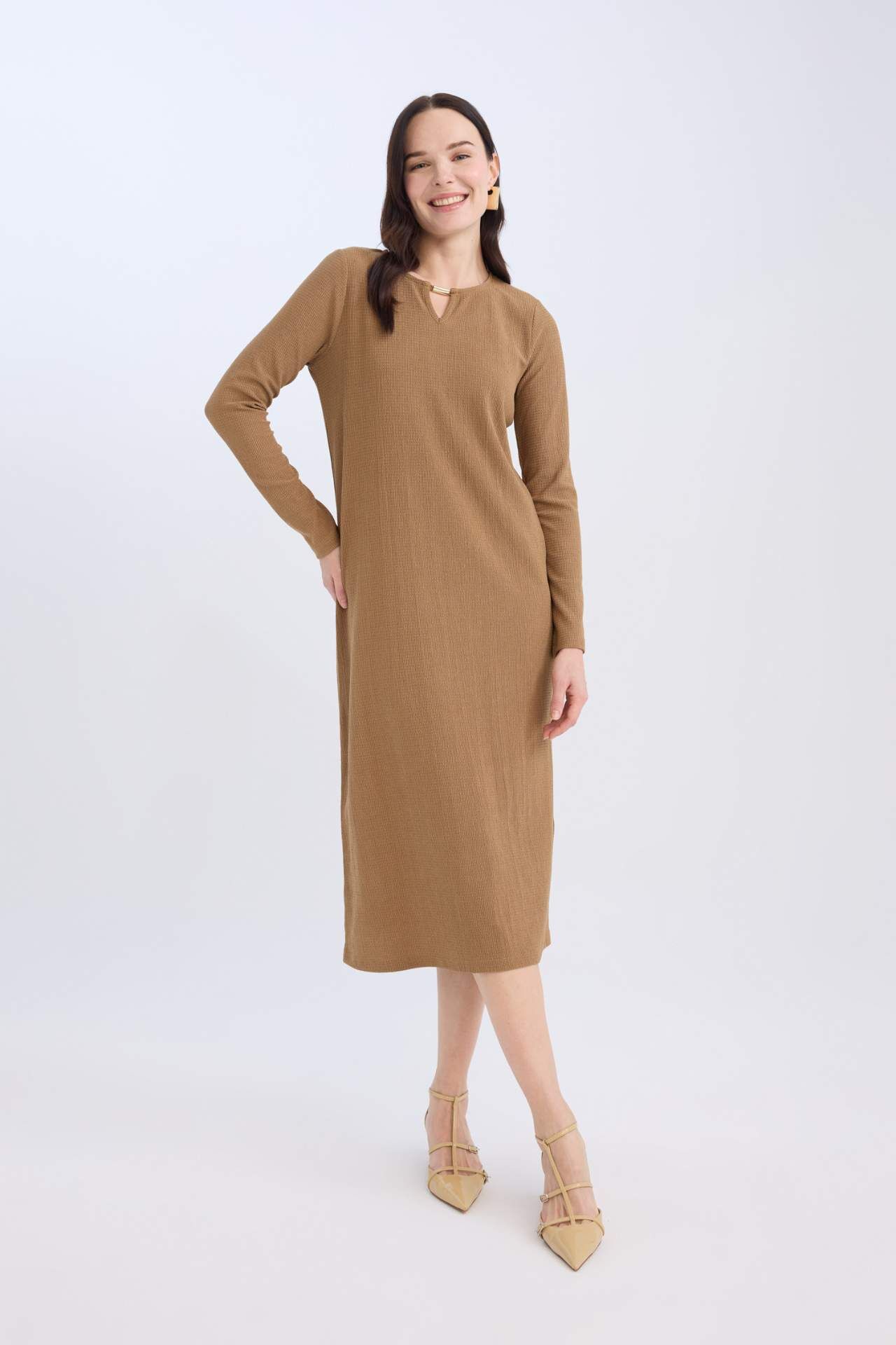 Bisiklet Yaka Basic Düz Bürümcük Uzun Kollu Maxi Elbise