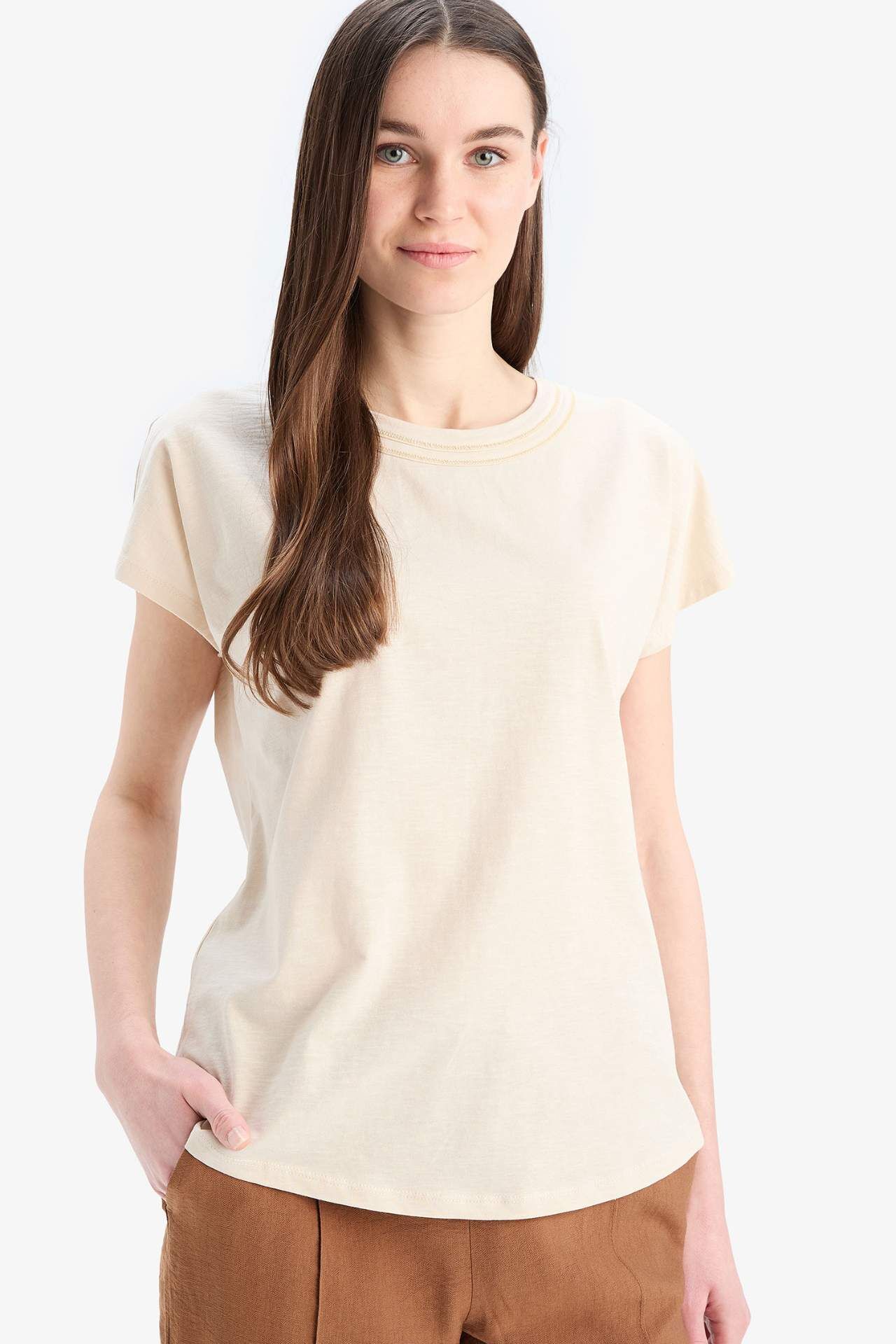 DeFacto Bisiklet Yaka Basic Düz Flamlı Pamuk Kısa Kollu Tişört E1159AX25SMBG155