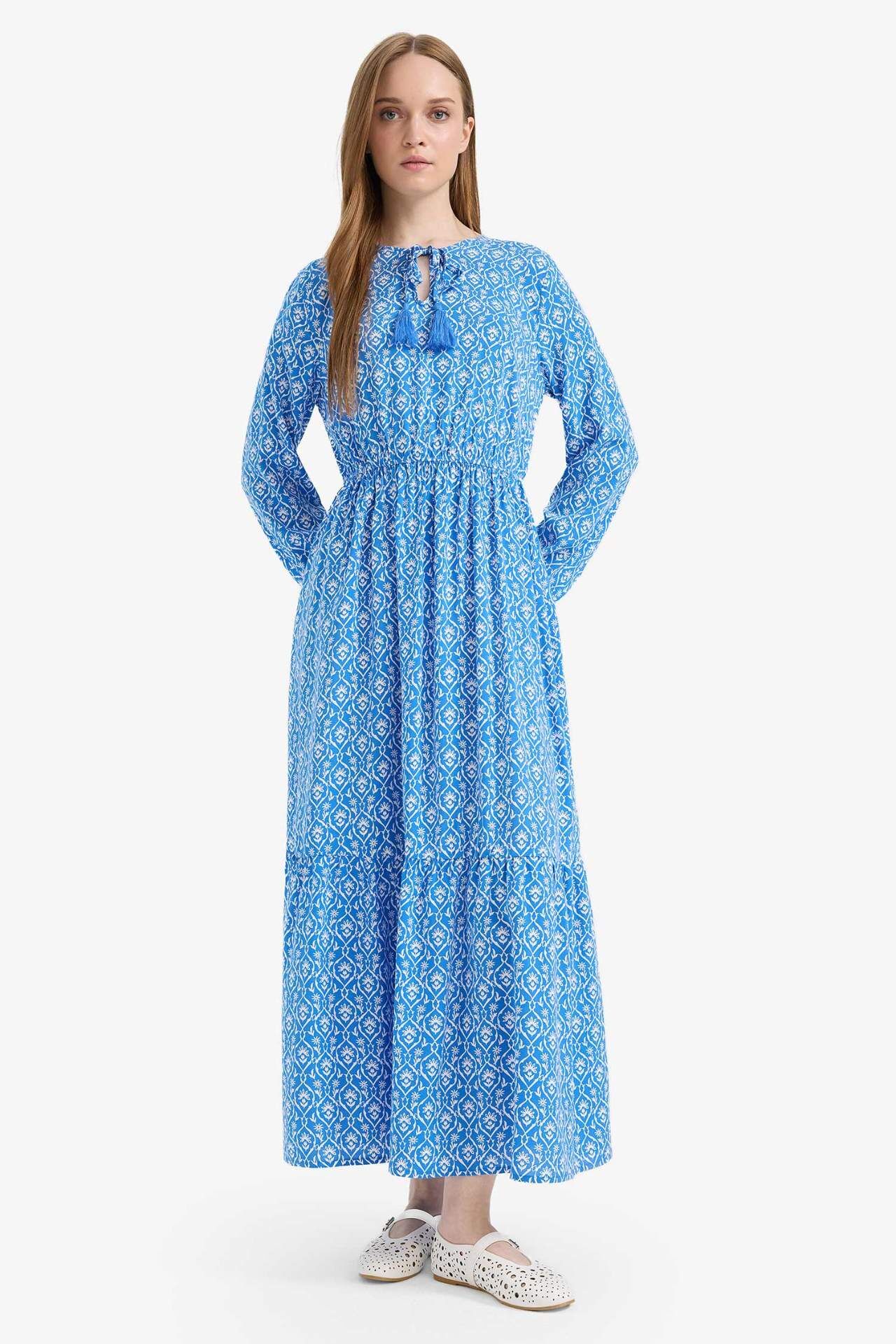 Bisiklet Yaka Baskılı Viskon Uzun Kollu Elbise
