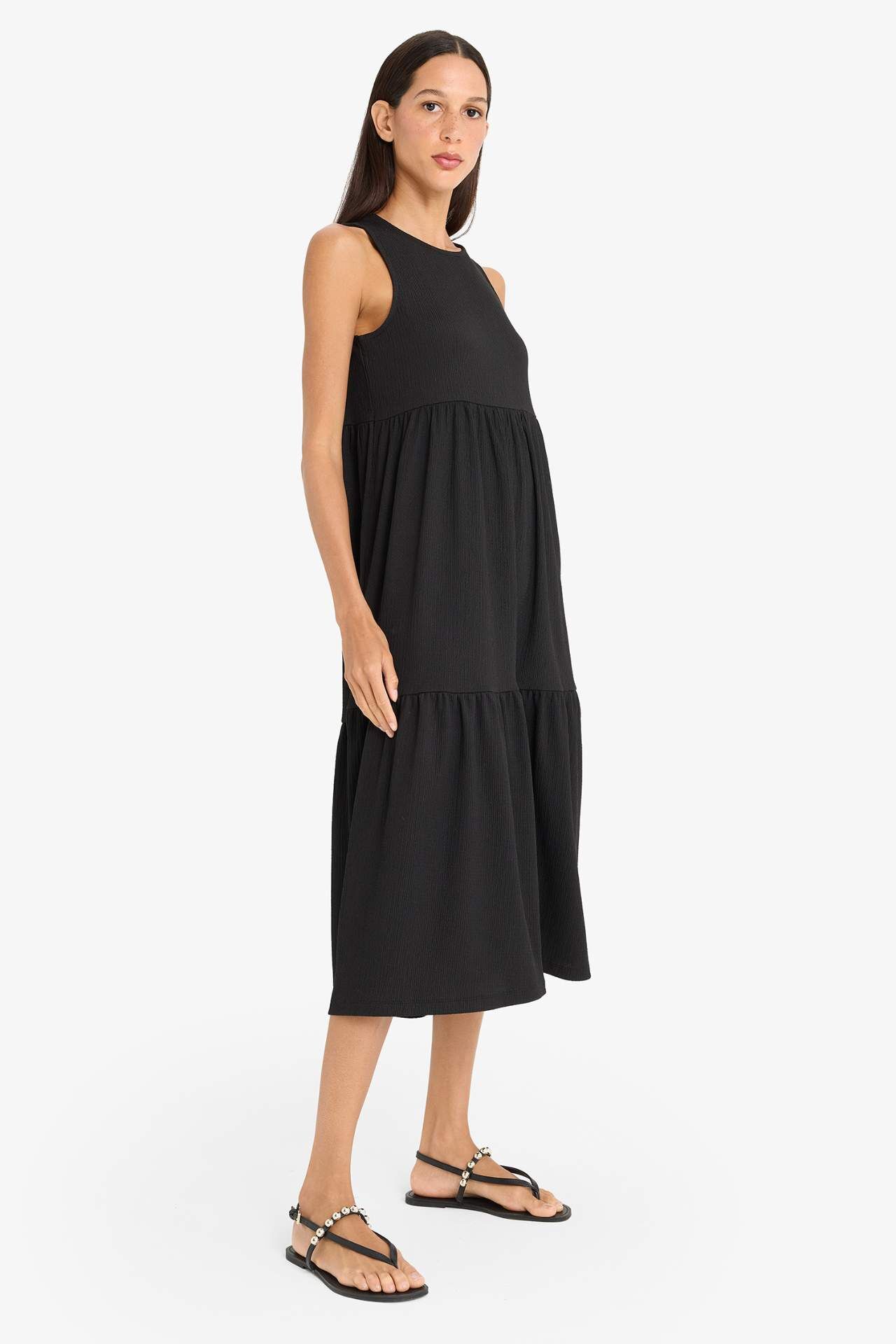 Bisiklet Yaka Bürümcük Kolsuz Midi Siyah Elbise