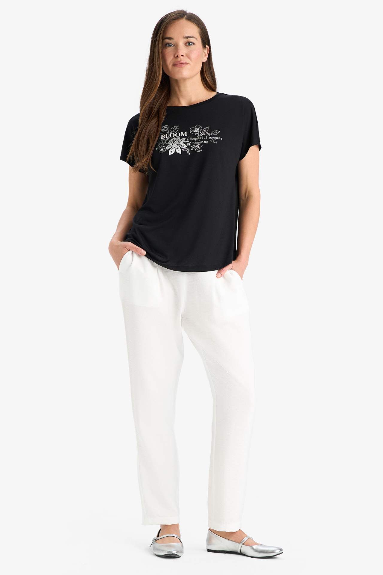 Zarif çiçek desenleriyle hareketlendirilen bisiklet yaka kısa kollu tişört, yumuşak dokusu ve hafif yapısıyla günlük kullanım için idealdir. Feminen ve rahat tarzı bir arada sunar. Viskoz 34%,Poliester 66%