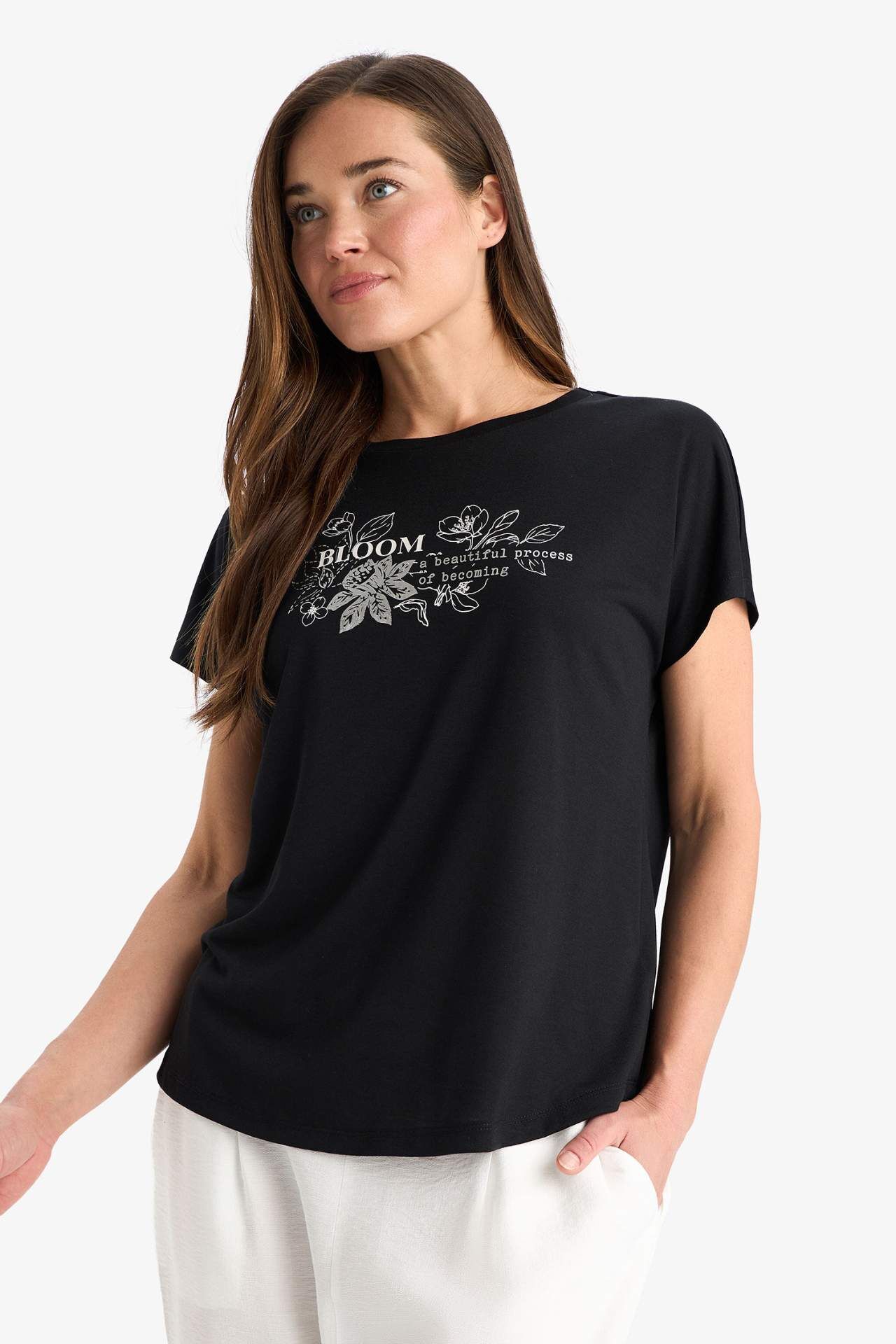 Bisiklet Yaka Çiçekli Kısa Kollu Tişört
