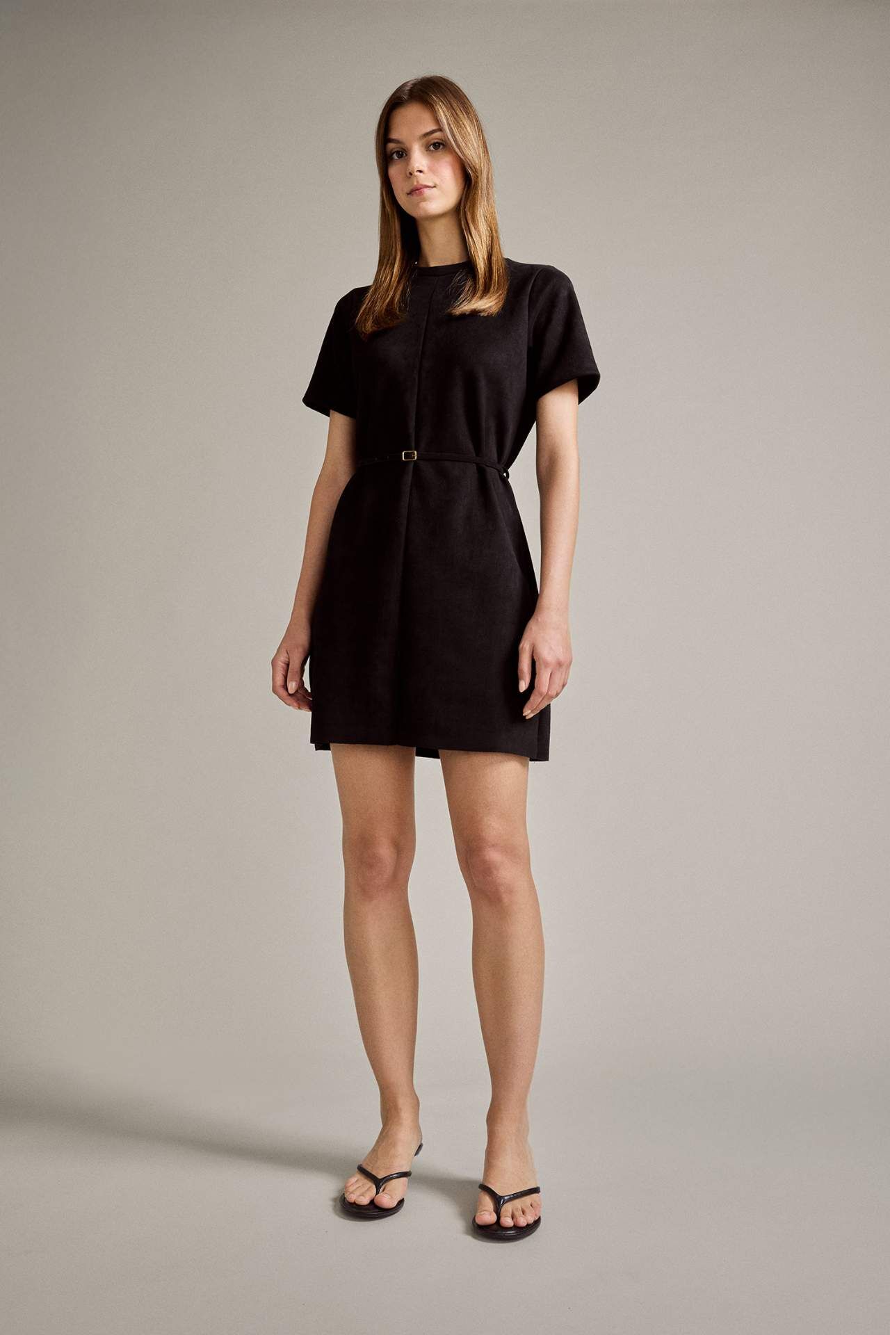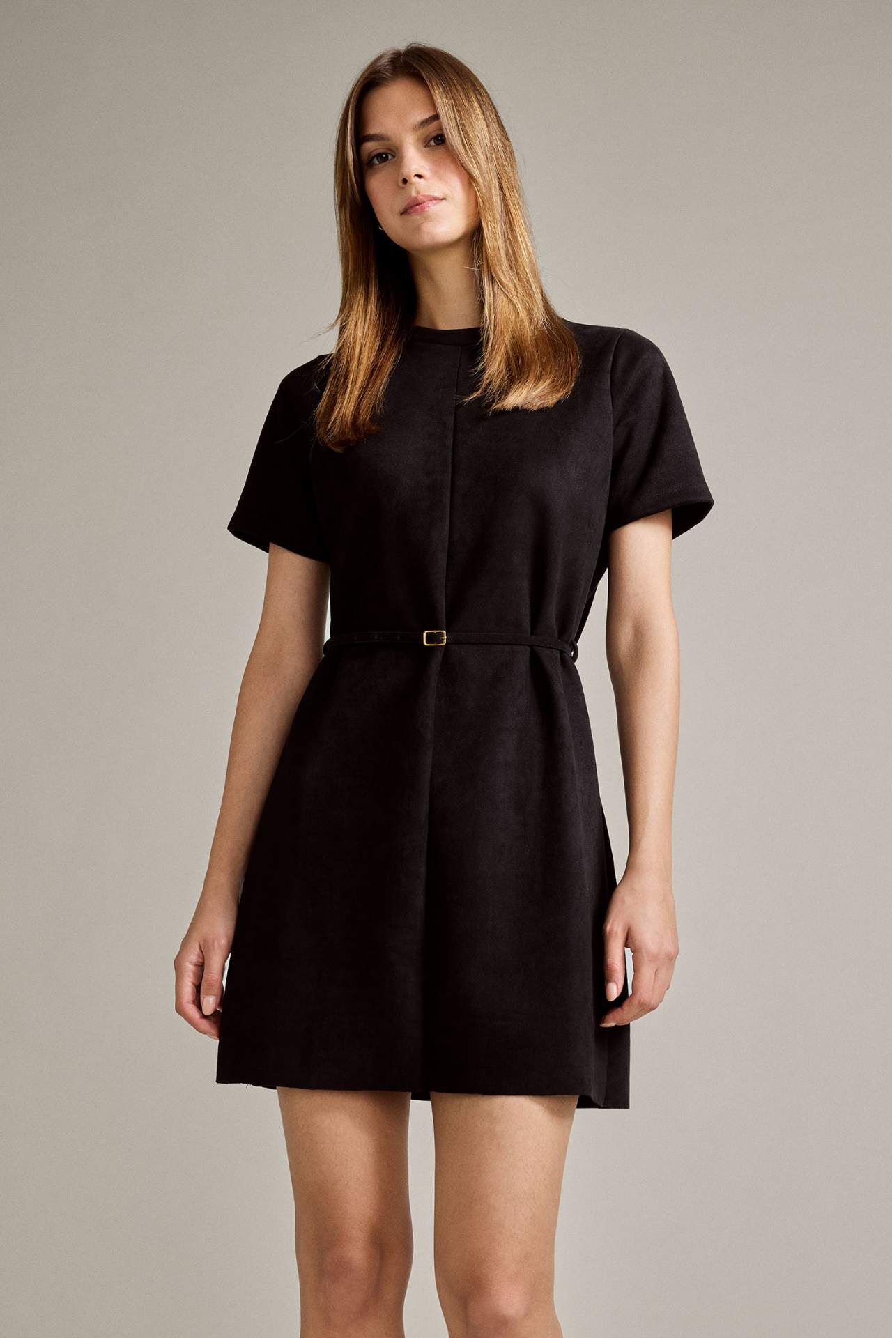 Bisiklet Yaka Kemerli Kısa Kollu Mini Süet Elbise