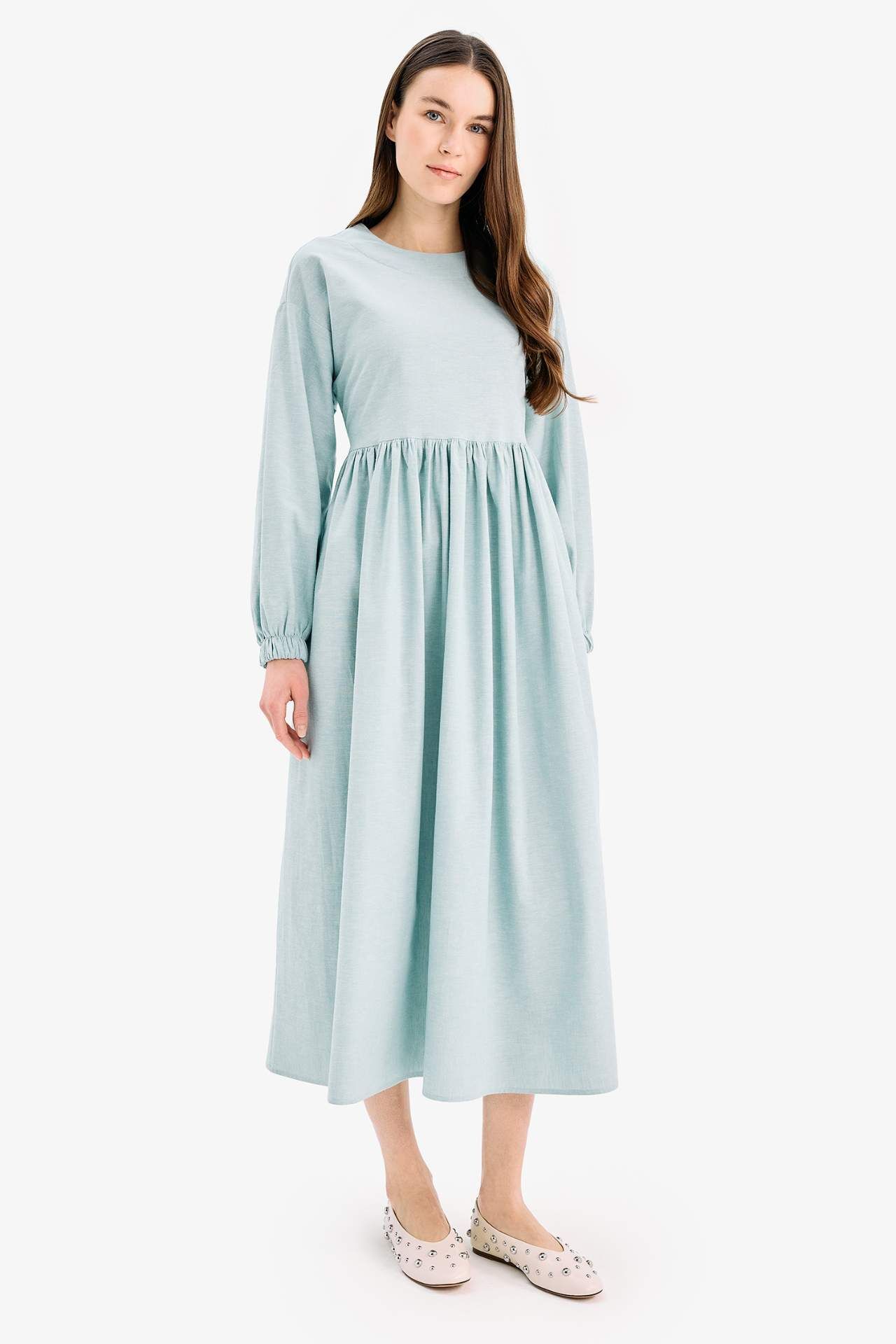Bisiklet Yaka Keten Karışımlı Uzun Kollu Maxi Elbise