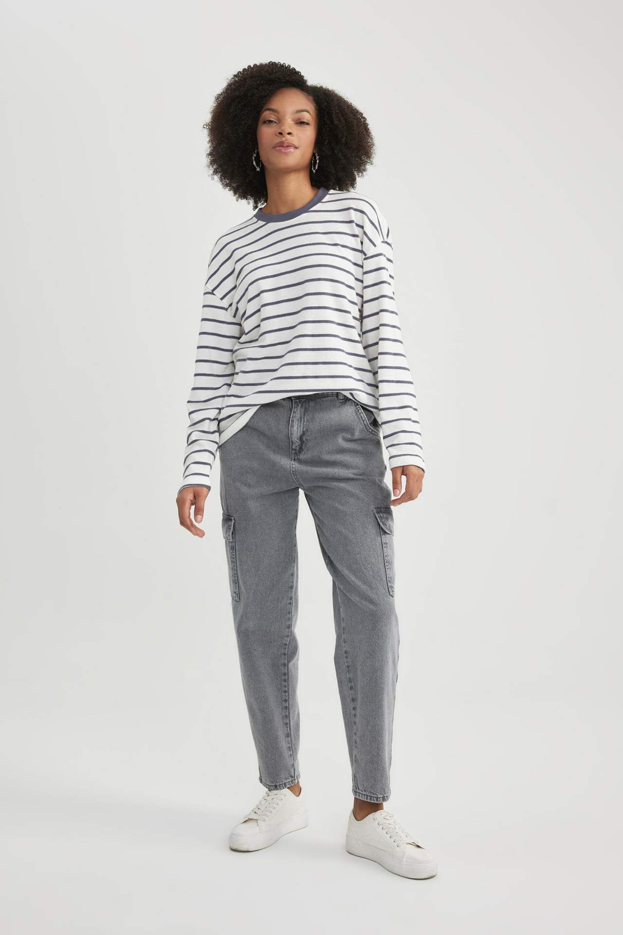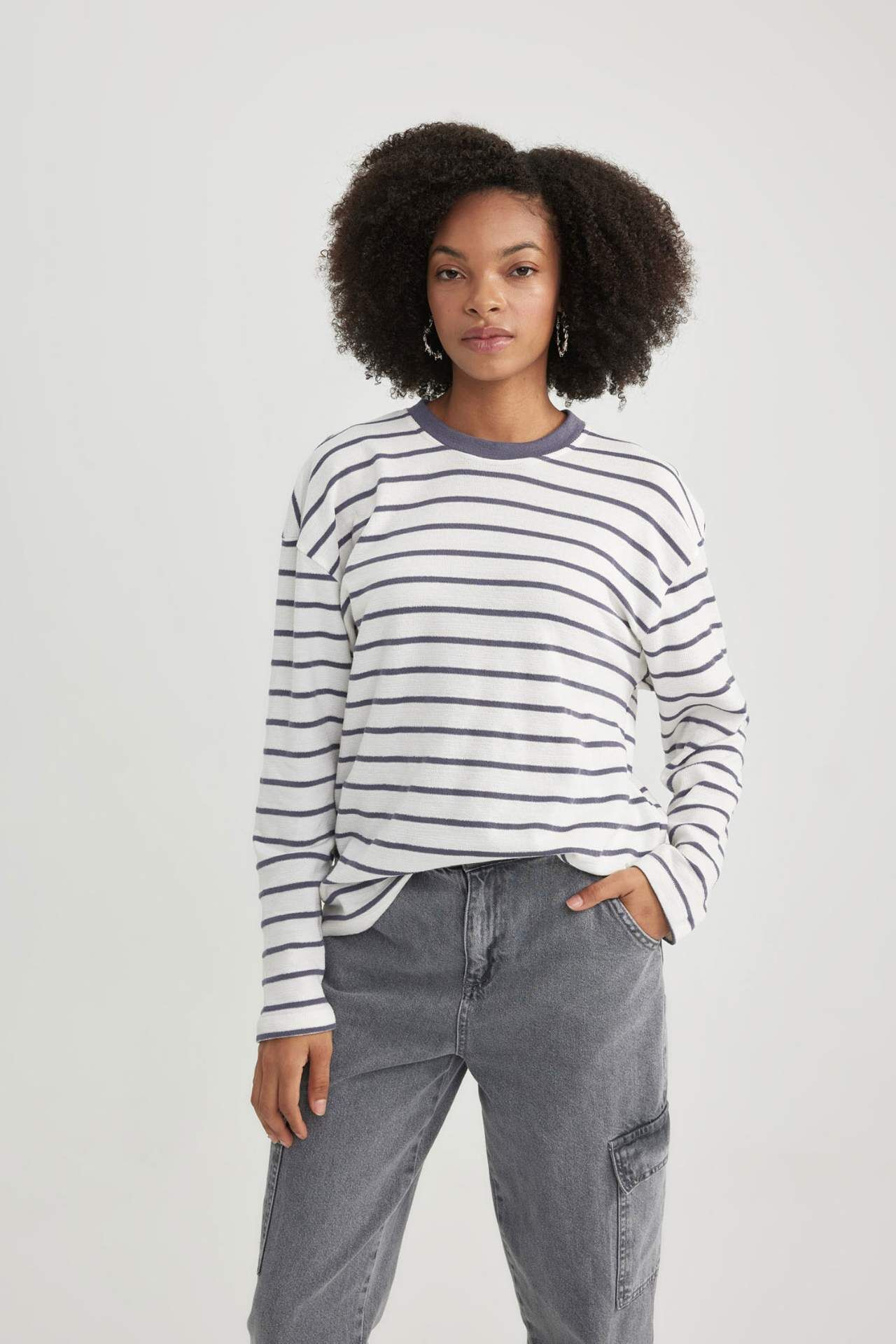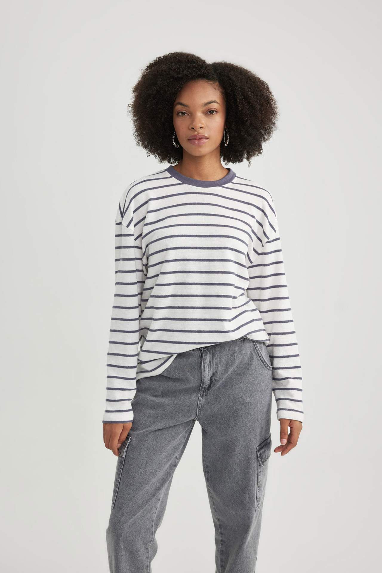 Bisiklet Yaka Çizgili Uzun Kollu Tişört, klasik çizgili deseni ve rahat kesimiyle şık bir günlük stil sunar. Yumuşak kumaşı, konforlu bir kullanım sağlar ve her mevsime uyum sağlar. Pamuk 76%,Poliester 24%