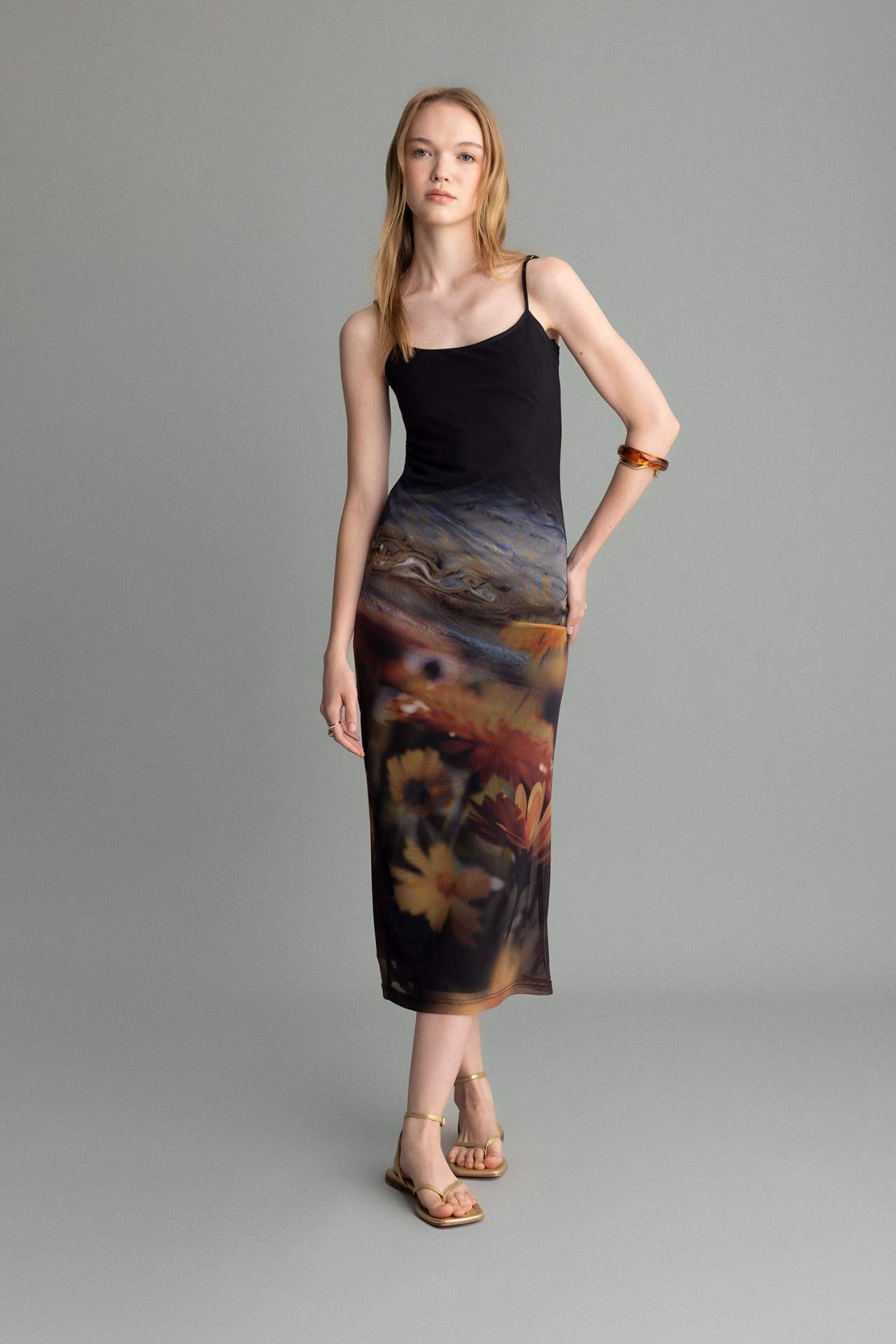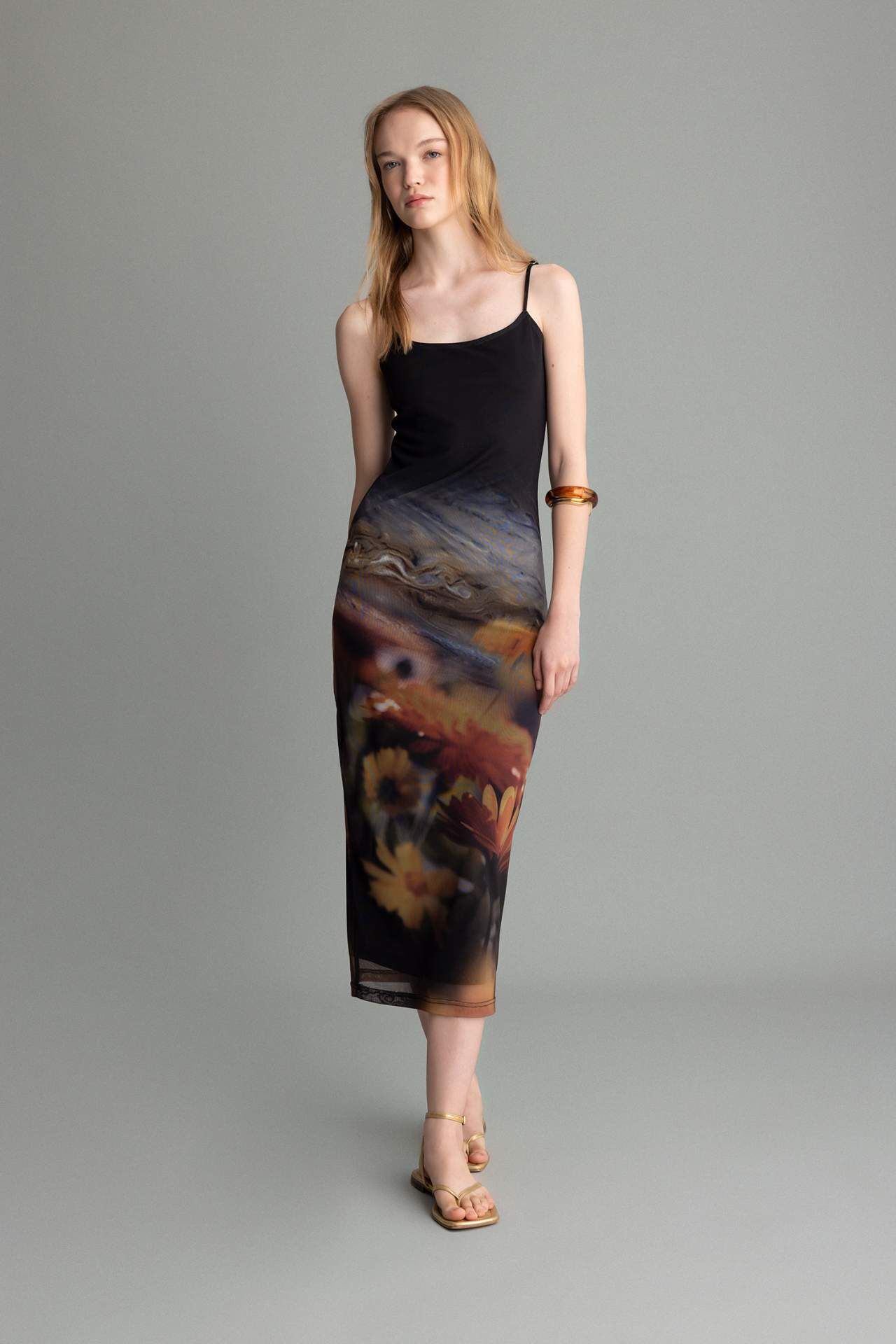 Bodycon Askılı Desenli Tül Askılı Maxi Elbise