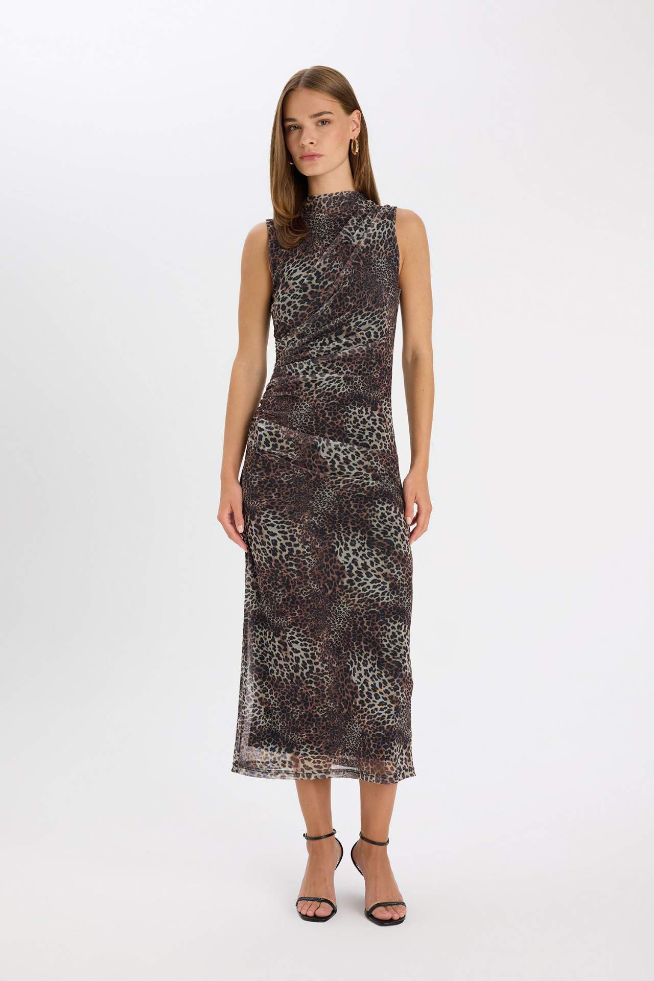 Bodycon Bisiklet Yaka Leopar Desenli Tül Kolsuz Maxi Elbise