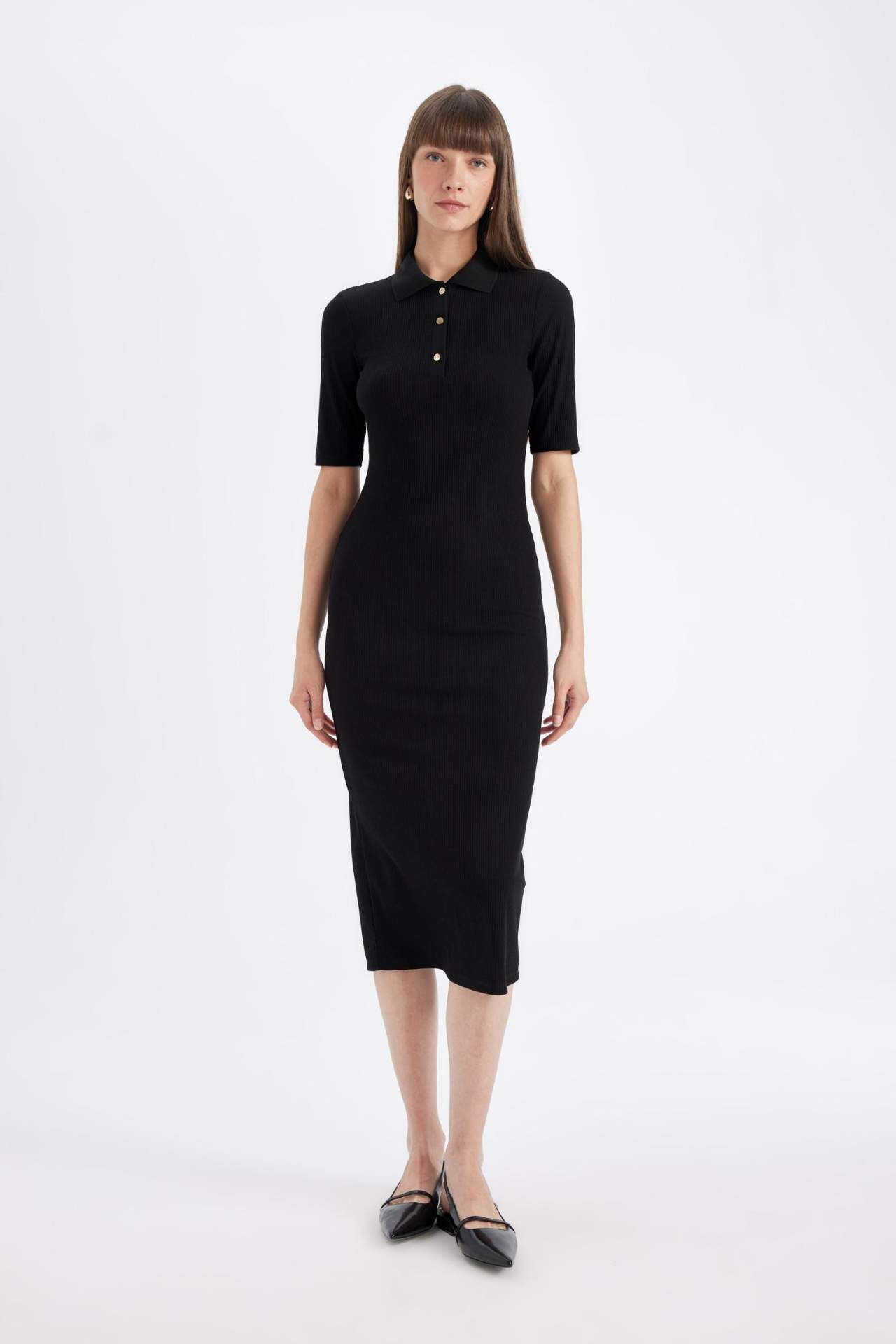 Bodycon Polo Yaka Fitilli Kaşkorse Kısa Kollu Midi Elbise