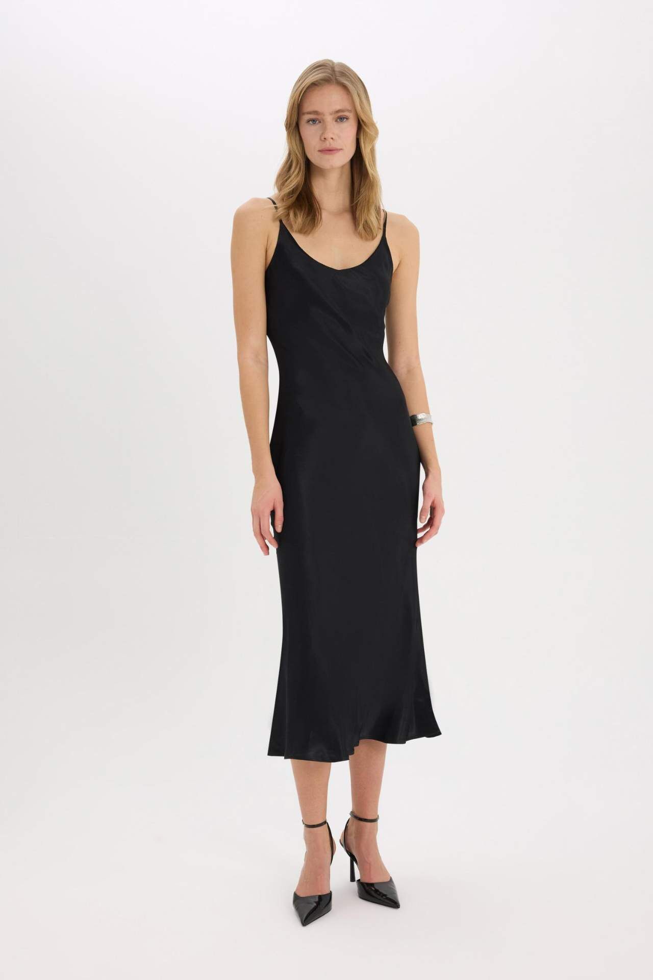 Bodycon vücudu saran basic düz saten kolsuz maxi siyah abiye elbise, sade şıklığı ve zarif dokusuyla dikkat çeker. Vücuda oturan kesimiyle feminen bir siluet sunarken, özel davetler için etkileyici bir tercih olur. Viskoz 100%,Viskoz 100%,Viskoz 100%,Viskoz 100%,Viskoz 100% Manken Bedeni: Göğüs: 80 Boy: 1,75 Basen: 90 Bel: 60