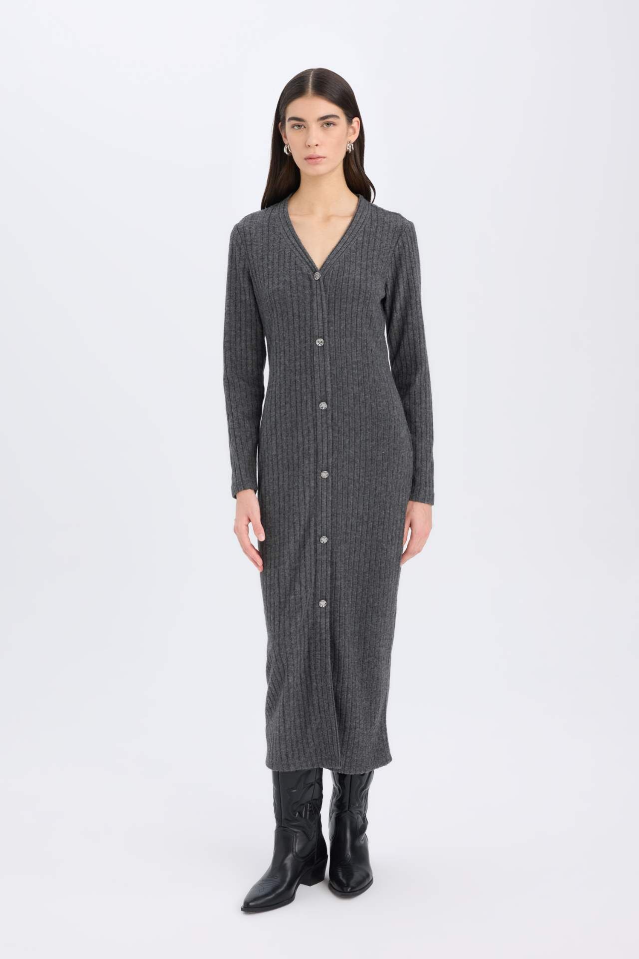 Bodycon Vücudu Saran Basic Düz V Yaka Düğmeli Fitilli Kaşkorse Midi Uzun Kollu Elbise