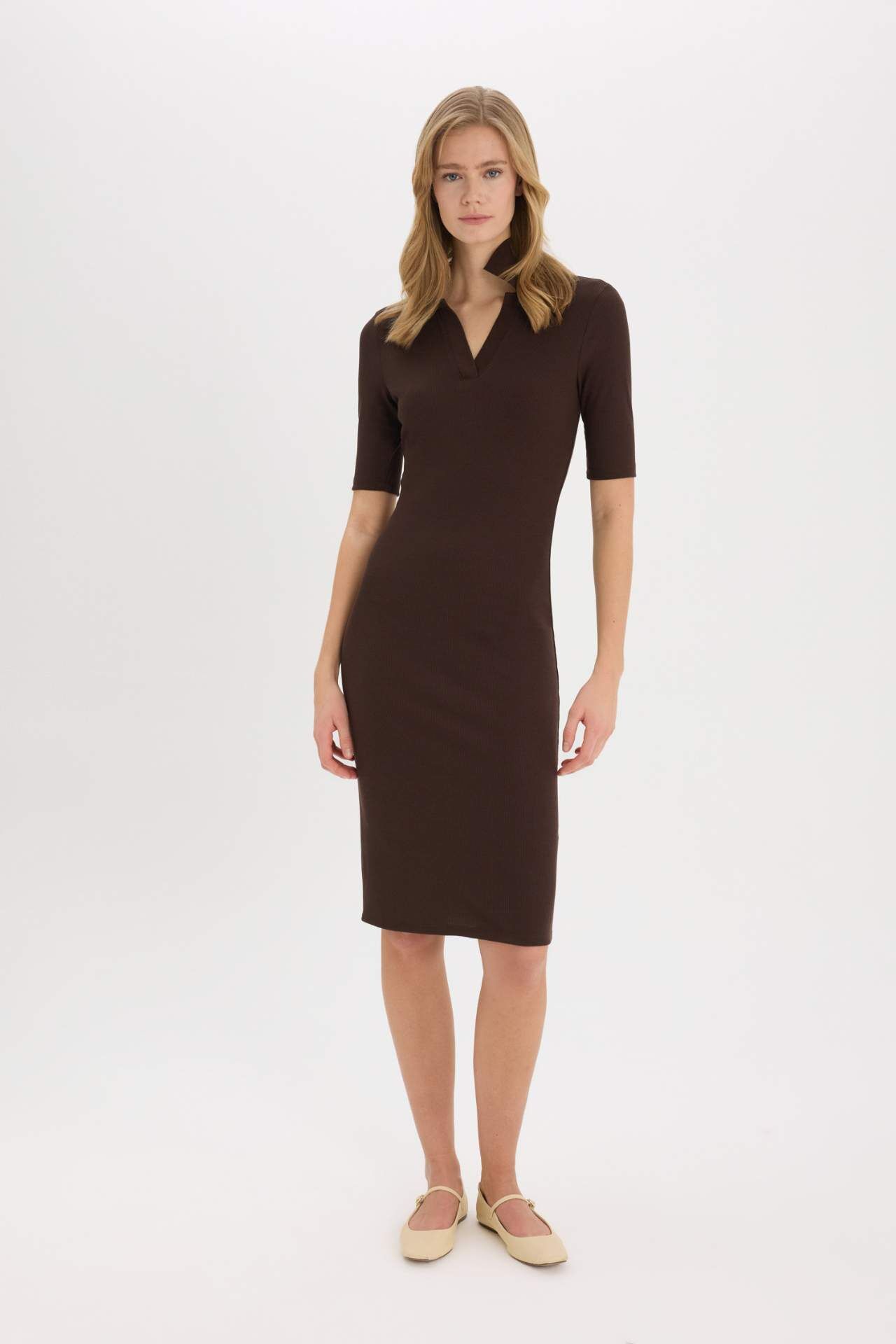 Yetişkinler için havalı bir kahve elbise. Bodycon vücudu saran kalıbı ve fitilli kaşkorse kumaşı ile dikkat çeker. Midi boyu ve kısa kollu yapısıyla yaz mevsiminde rahatlıkla kullanılabilir. Polo yaka detayıyla şıklığı ve zarafeti bir araya getiriyor. Trend ve temel çeşit arasında yer alıyor. Elastan 2%,Viskoz 35%,Poliester 63%,Elastan 2%,Viskoz 35%,Poliester 63%,Elastan 2%,Viskoz 35%,Poliester 63%,Elastan 2%,Viskoz 35%,Poliester 63%,Elastan 2%,Viskoz 35%,Poliester 63% Manken Bedeni: Göğüs: 0 Boy: 0 Basen: 0 Bel: 0