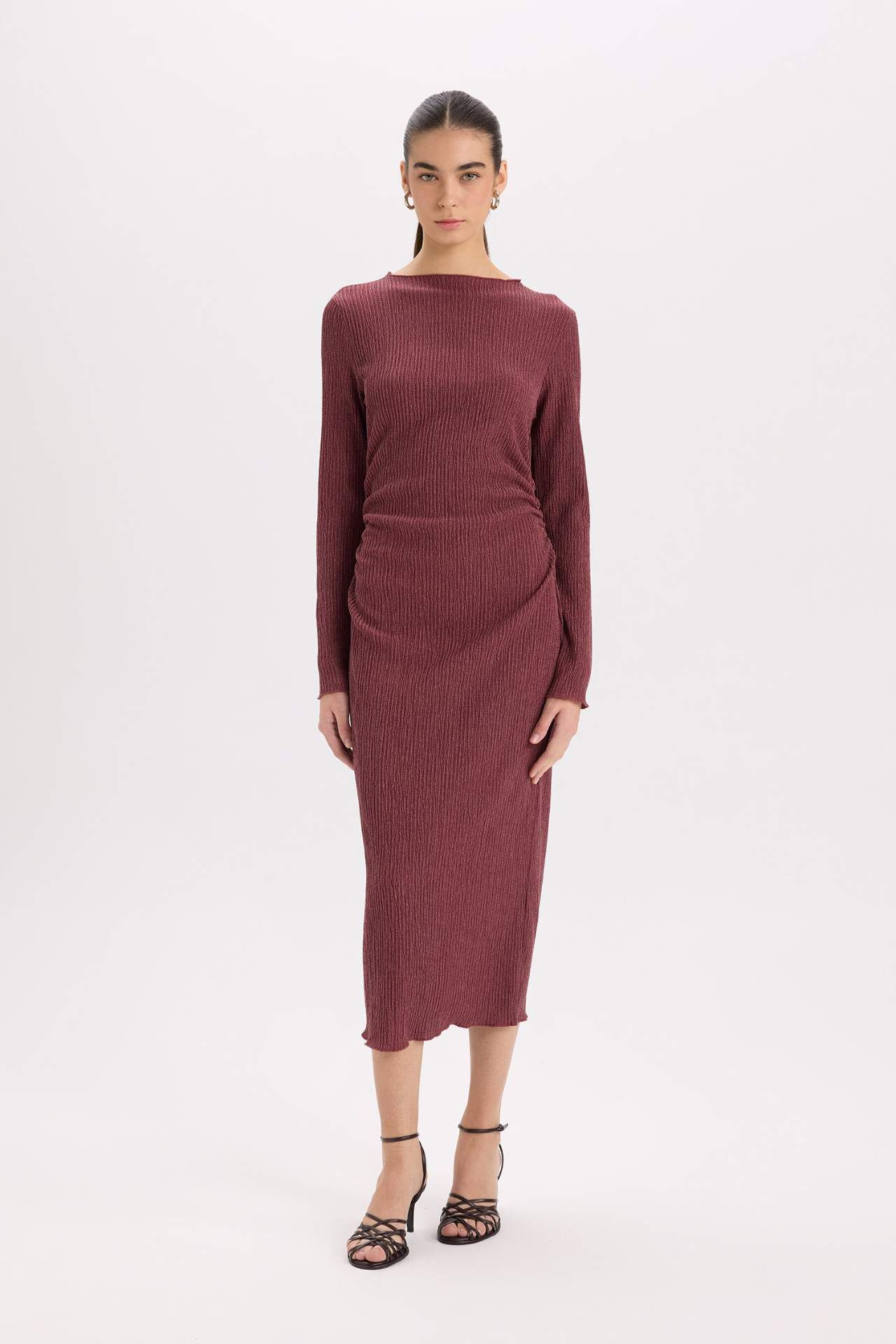 DeFacto Bodycon Vücudu Saran Yarım Balıkçı Yaka Basic Düz Bürümcük Uzun Kollu Midi Bordo Elbise