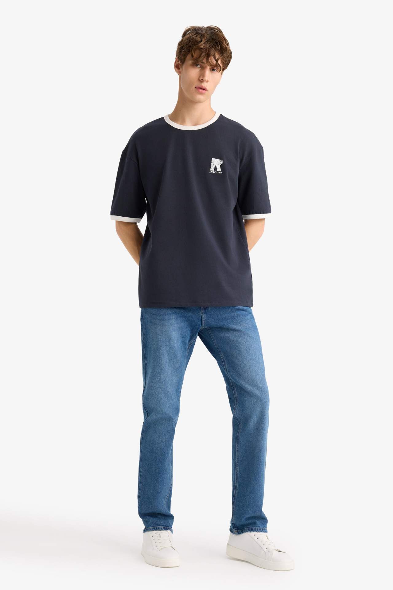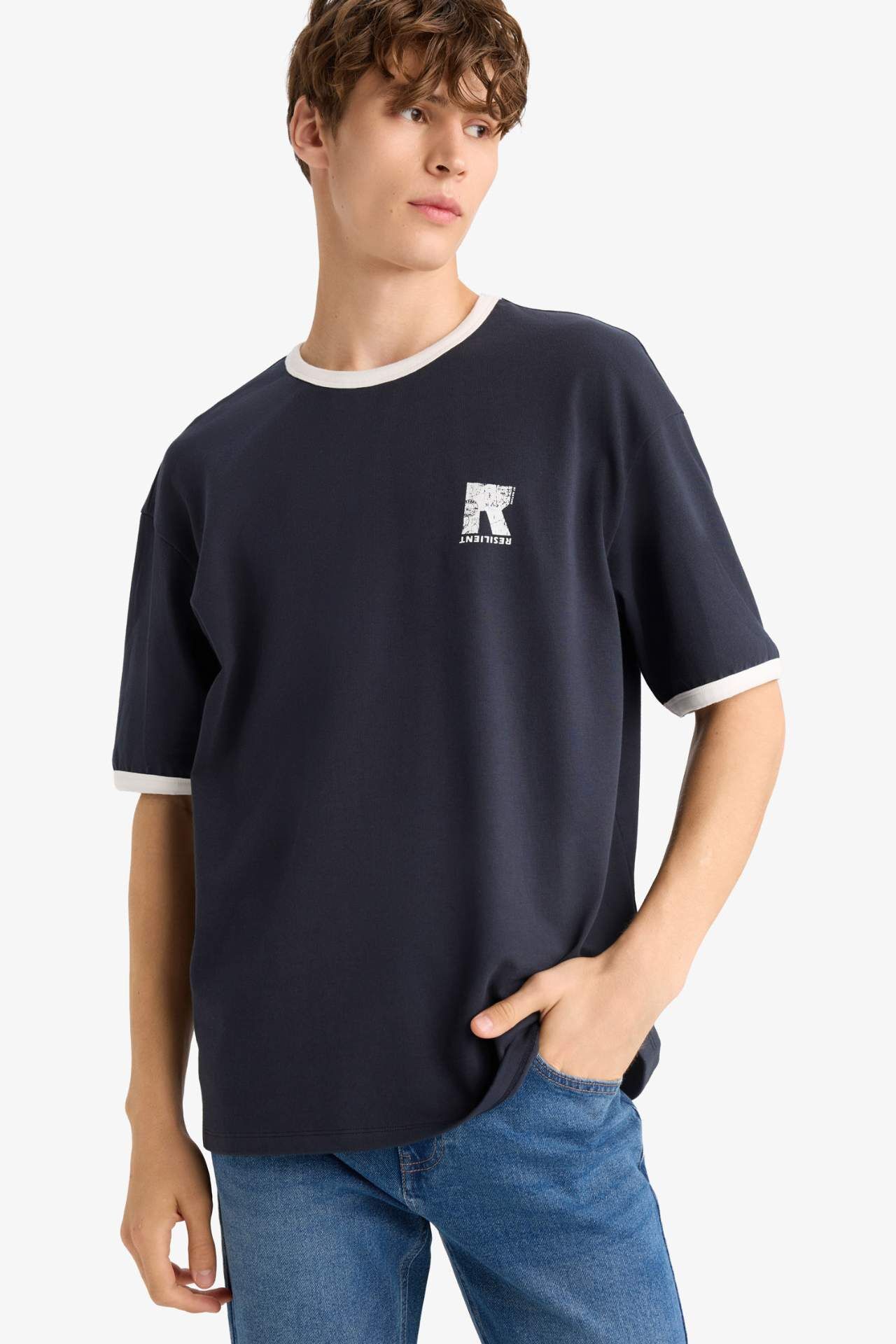 DeFacto Boxy Fit Bisiklet Yaka Baskılı Kısa Kollu Tişört G0001AX25HSNV64