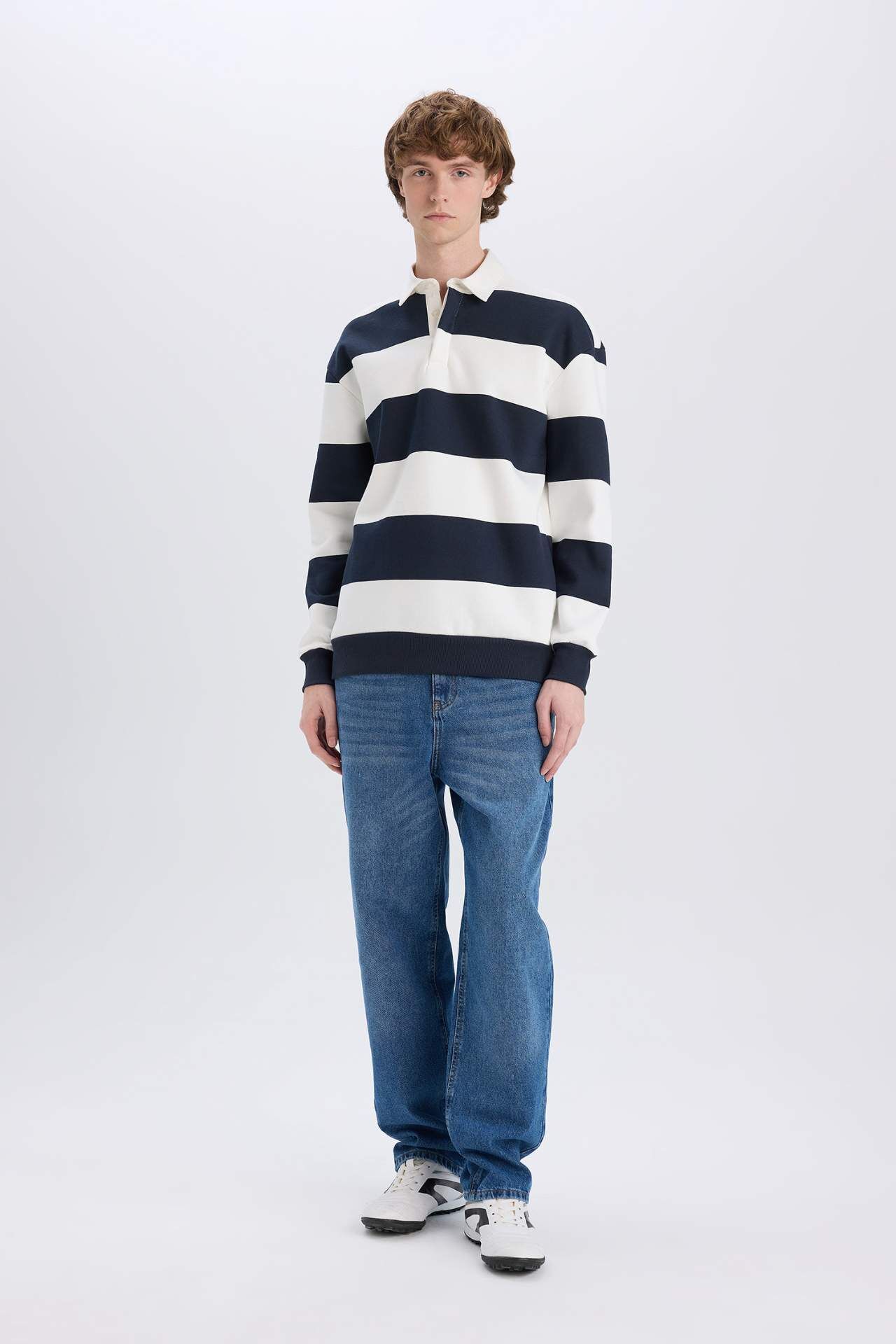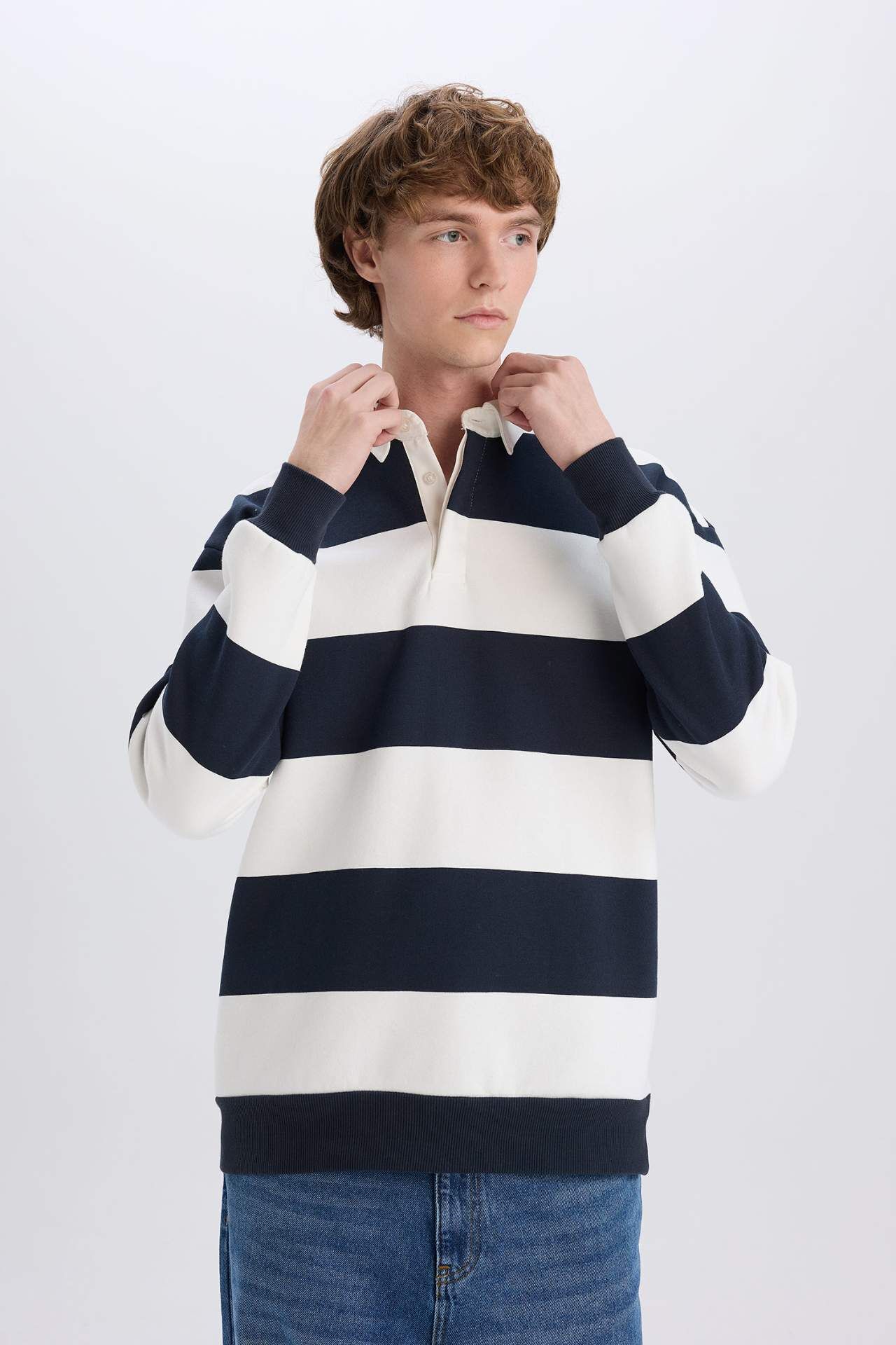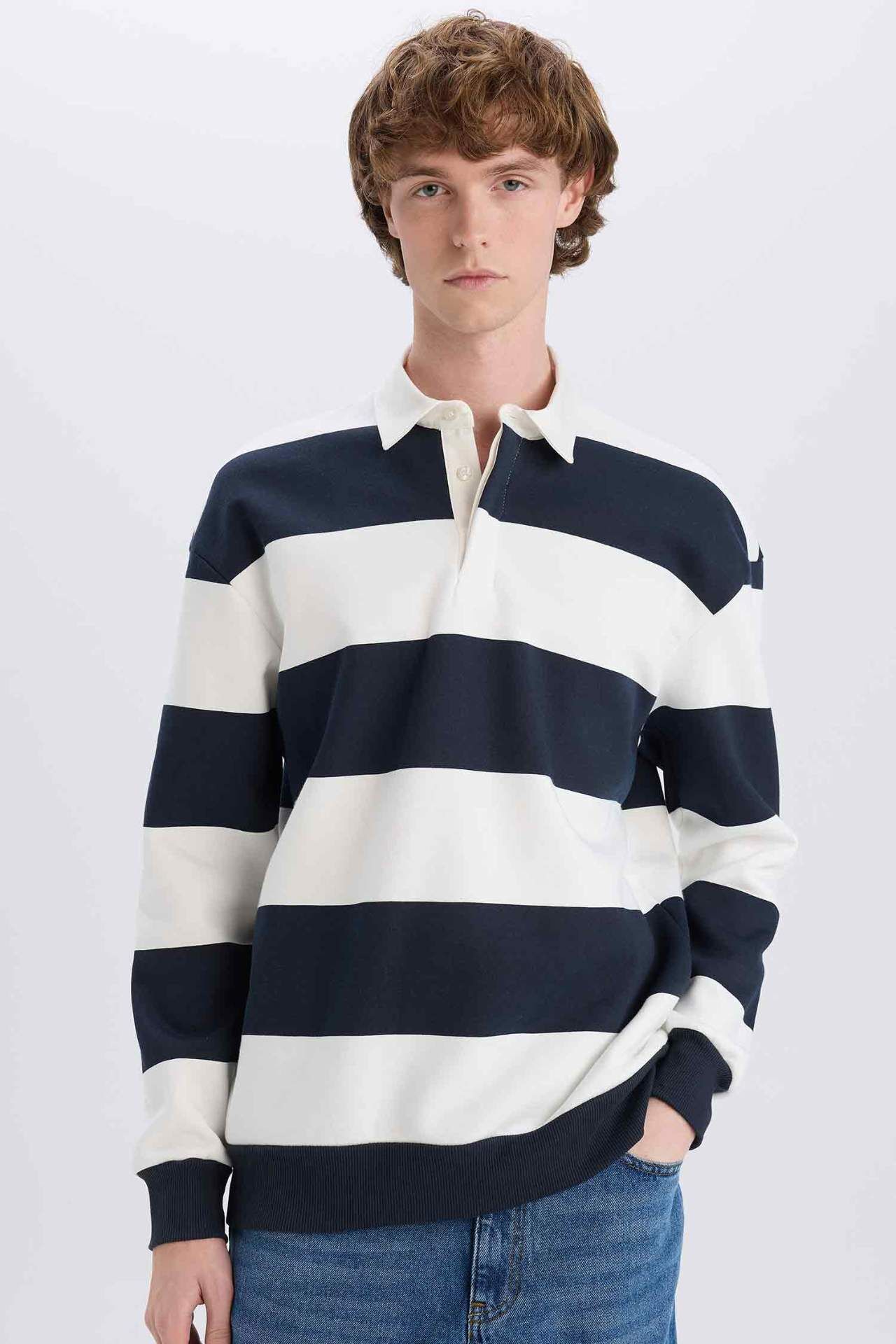 DeFacto Boxy Fit Polo Yaka Çizgili Sweatshirt D1784AX24WNNV82